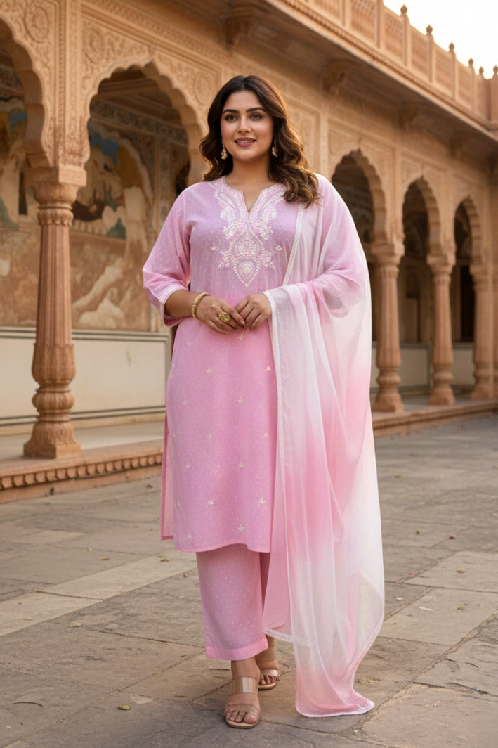Step into ethnic wear with our stunning collection of Kurta suit sets and sarees including Bandhani & Leheriya, perfect for both casual and formal occasions, blending intricate patterns and exquisite detailing. For plus-size customers, explore our diverse range of Palazzo sets, offering style with comfortable palazzo pants. Experience Jaipur tradition and modernity fused in our kurta suit sets and Kurta Skirt sets with contemporary flair for a unique, stylish look. For comfort chic, opt for our Kaftan Co-ord Sets, featuring loose-fitting silhouettes. Indulge in the rich tapestry of Indian heritage with our exquisite Jaipuri kurta sets like Bandhani Kurta sets and Angrakha kurta sets. Utilizing a unique tie and dye method, these sets boast distinctive patterns, celebrating the vibrant essence of Indian culture. Most of our suit sets, from traditional Anarkali suits to printed straight-cut kurtas, reflect the beauty of our cultural heritage and to elevate your style and celebrate your ethnicity.