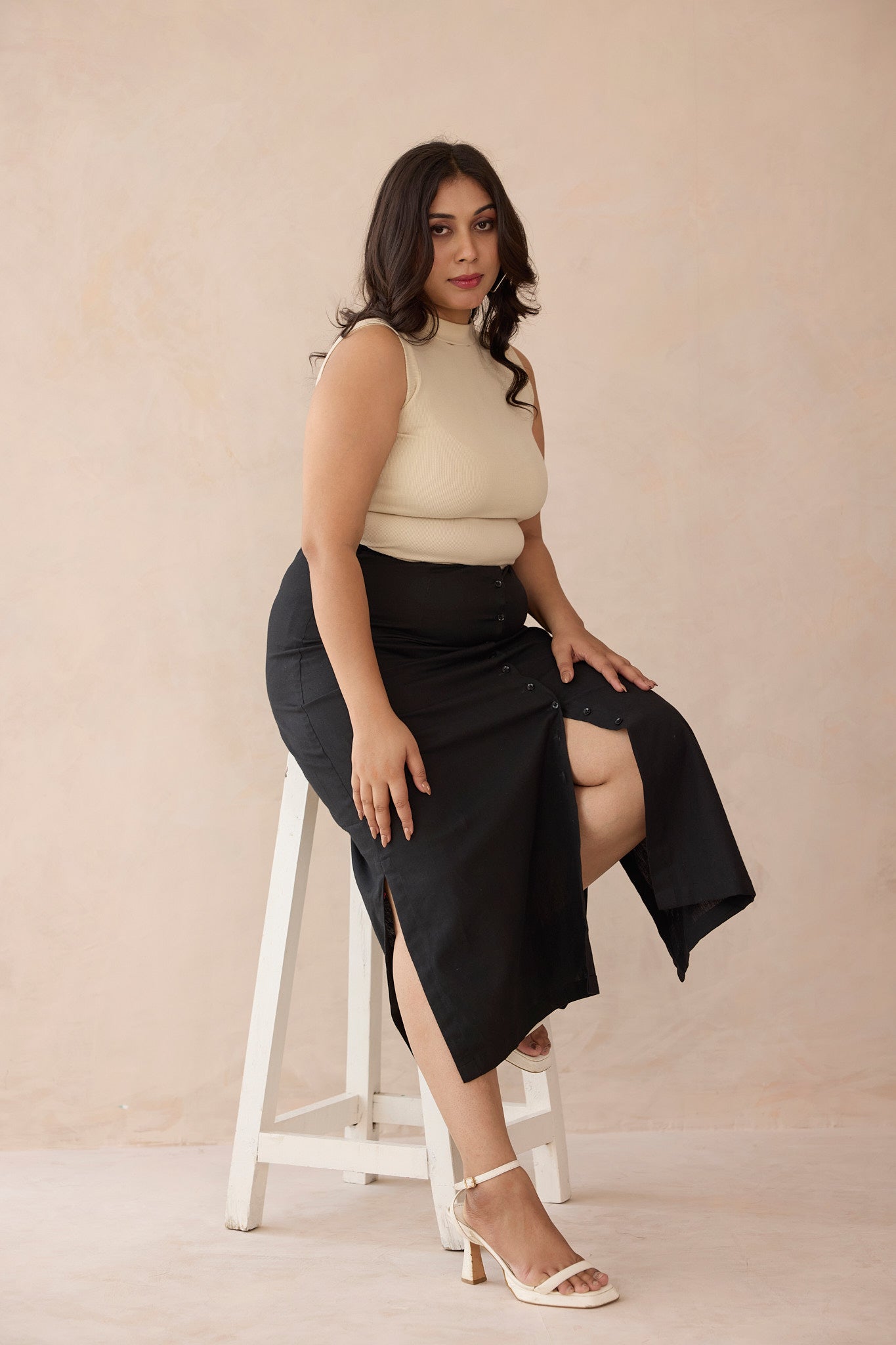 Work your style effortlessly with this Chic Black High-Waisted Linen Midi Skirt designed to flatter the waist and elongate the legs. Crafted from 100% cotton linen fabric, it features a straight fit and a sleek button closure running down the right side with openable black buttons. A subtle front slit below the last button ensures ease of movement and adds a refined touch of elegance making it perfect for both casual and professional settings. A versatile wardrobe staple perfect for both casual and dressy occasions.