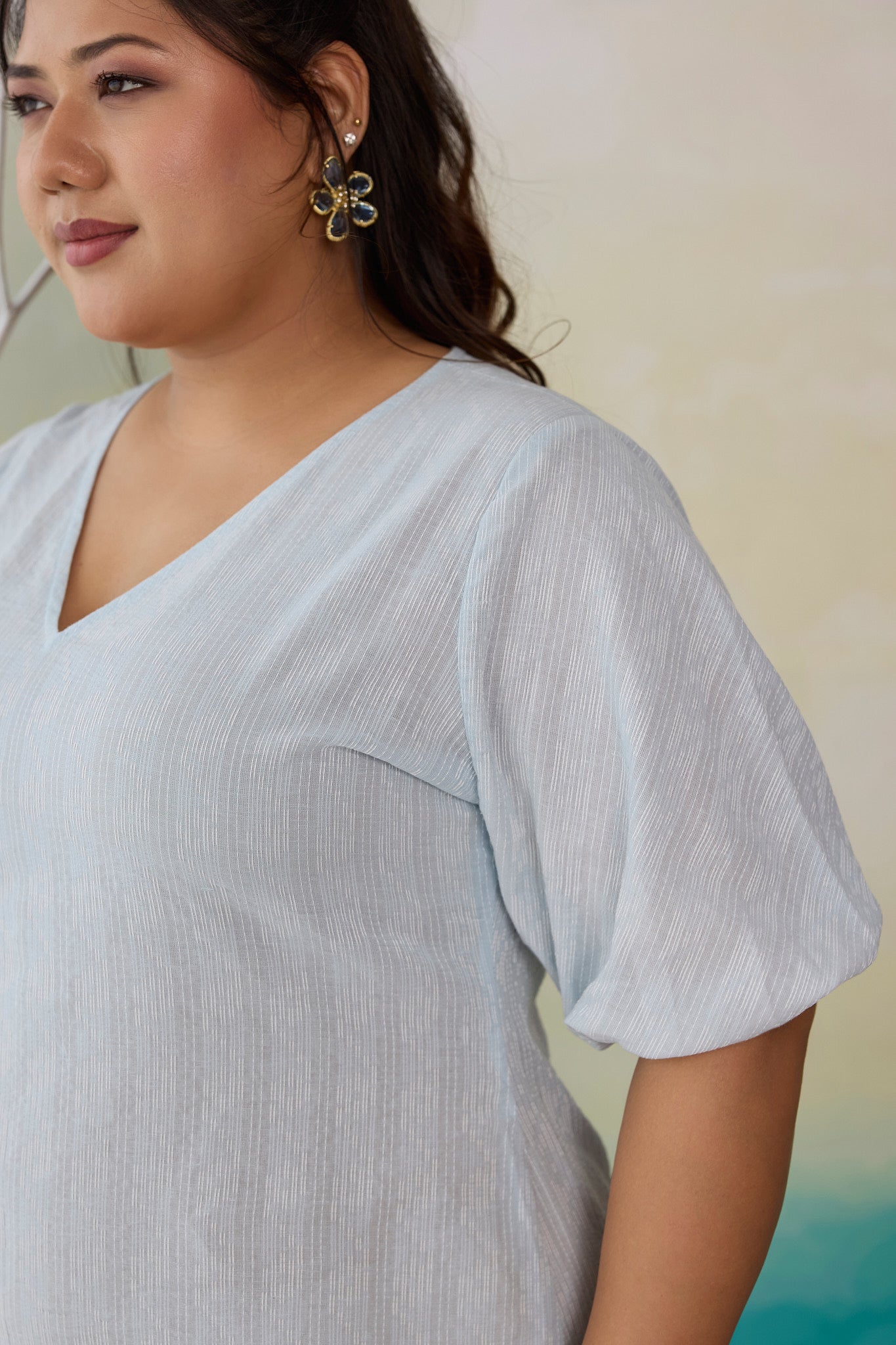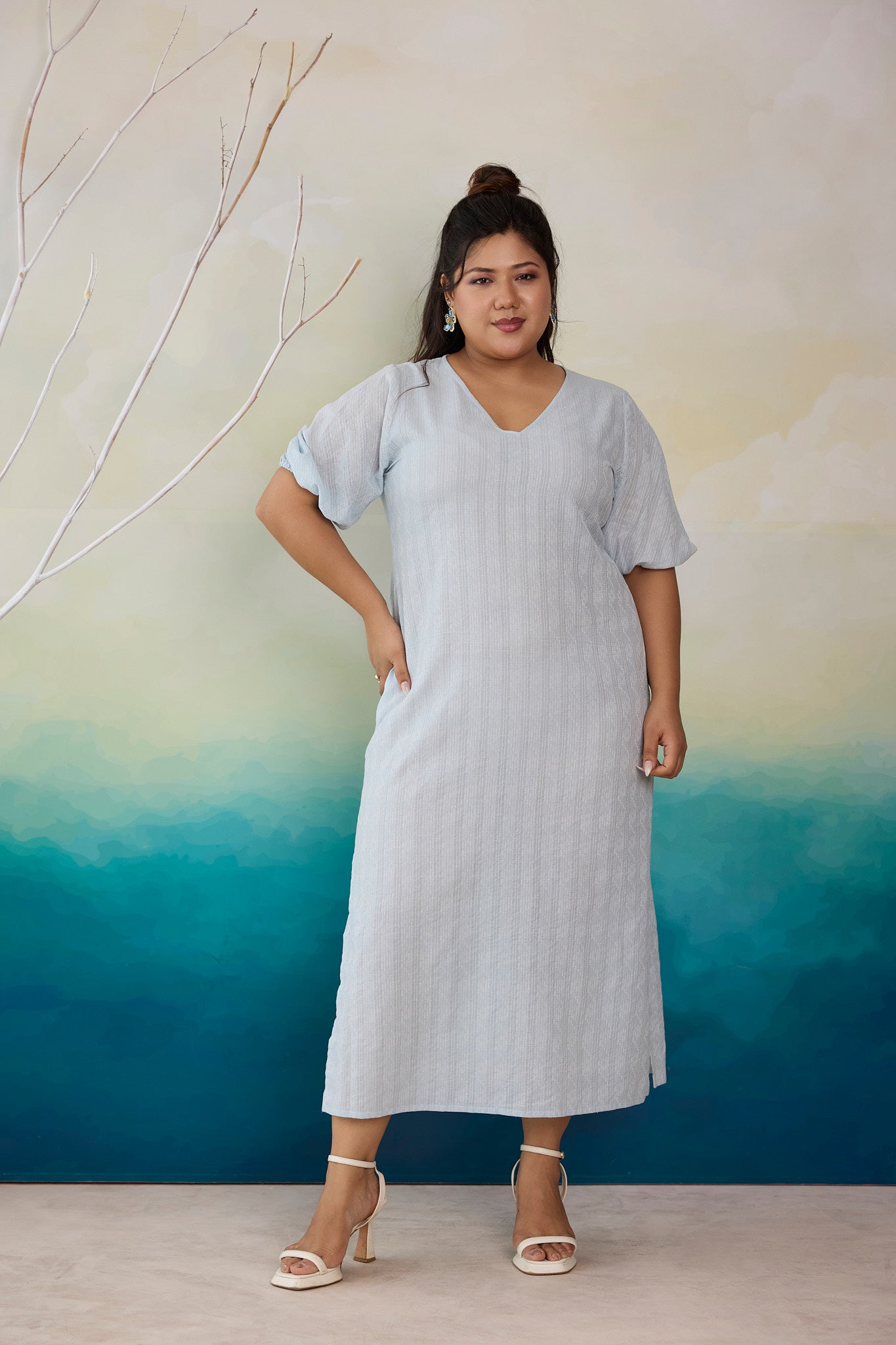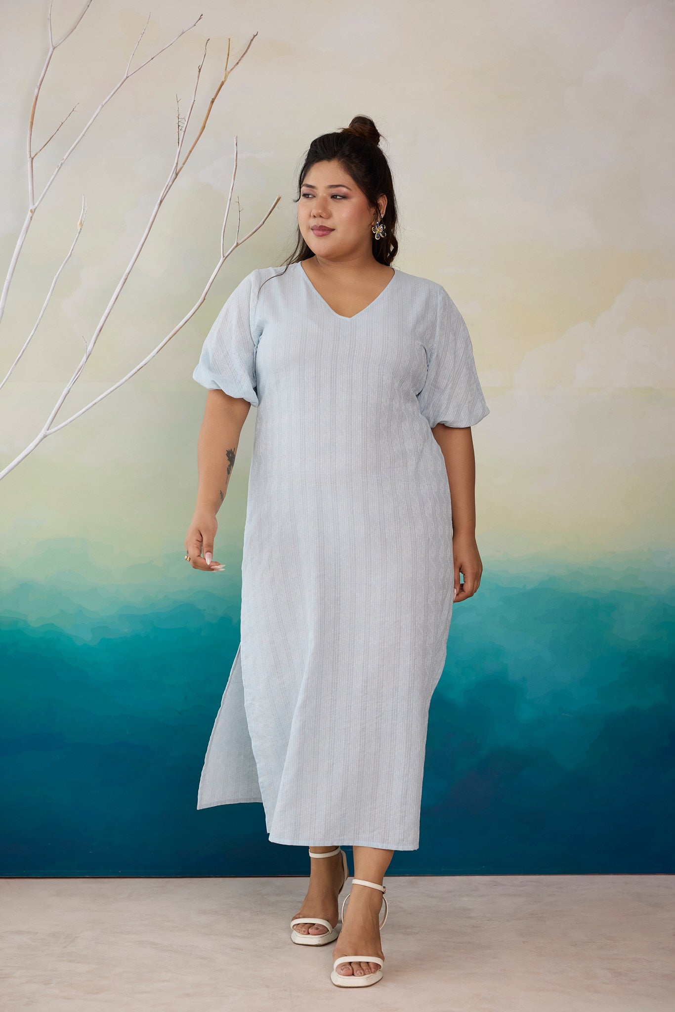A breeze wrapped in stitches of tradition—this Powder Blue Kantha Cotton Maxi Dress is all things serene and soulful. Crafted from 100% cotton Kantha fabric, it radiates gentle charm with a touch of artisanal finesse. The dreamy powder blue hue soothes the eye, while subtle textured kantha lines whisper tales of handcrafted grace. Designed with a soft V-neckline and half puff sleeves, it floats into a relaxed silhouette that flares gently into a side-slit hem, adding just the right dash of drama. Light, breathable, and timeless, this is your go-to for slow days, long strolls, or a quiet evening under the sky.