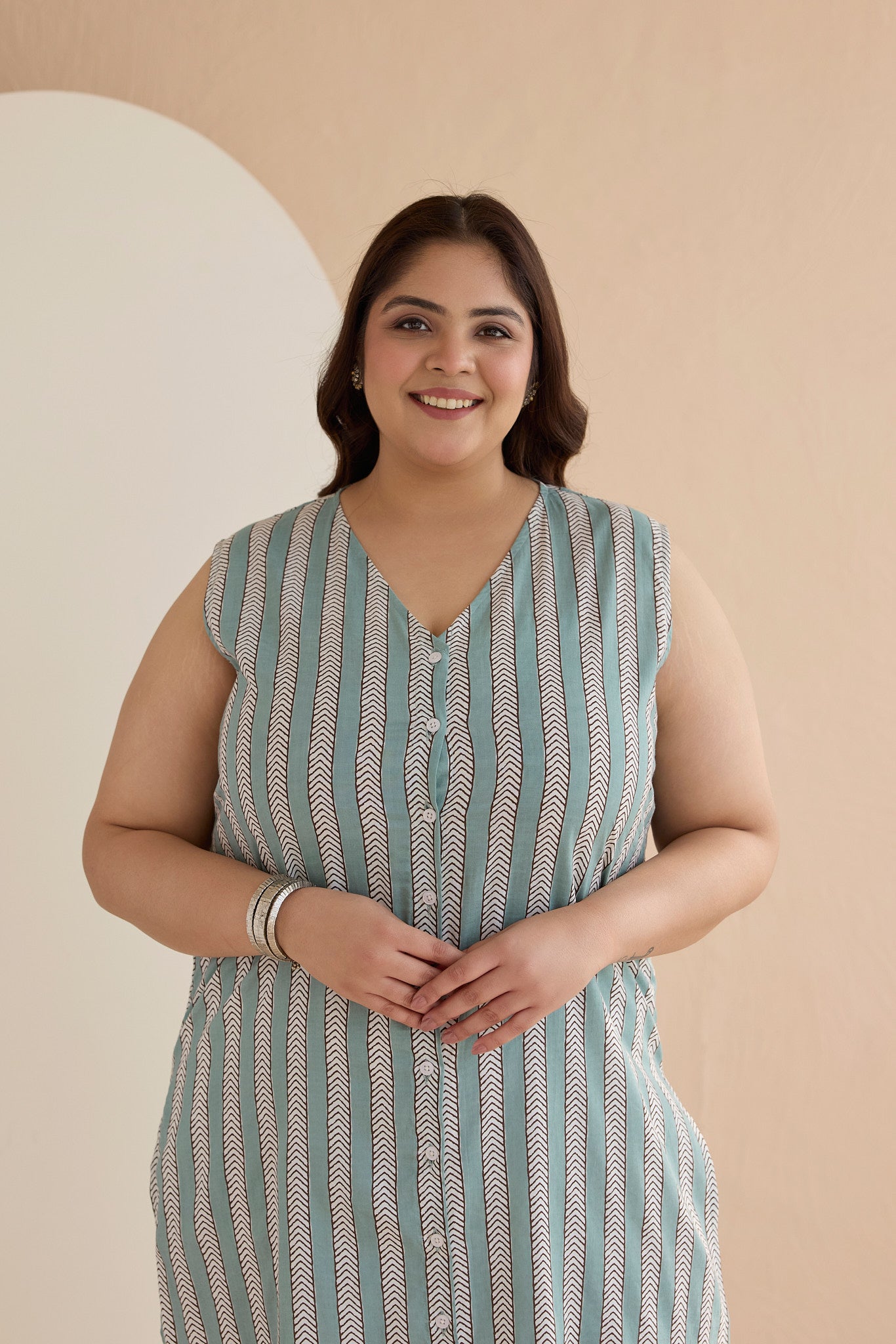 Make a breezy yet bold statement in this Teal Striped Cotton Shirt Kurta Set. Designed in 100% soft cotton, the straight-cut sleeveless kurta draws the eye with its striking teal blue striped pattern and fluid silhouette. A flattering V-neckline and functional front buttons lend a touch of versatility, while the crisp white straight-cut pants, with a comfy elastic waistband complete the effortlessly chic look. Perfect for brunch dates or vacation strolls, this set blends comfort and charm in equal measure.
