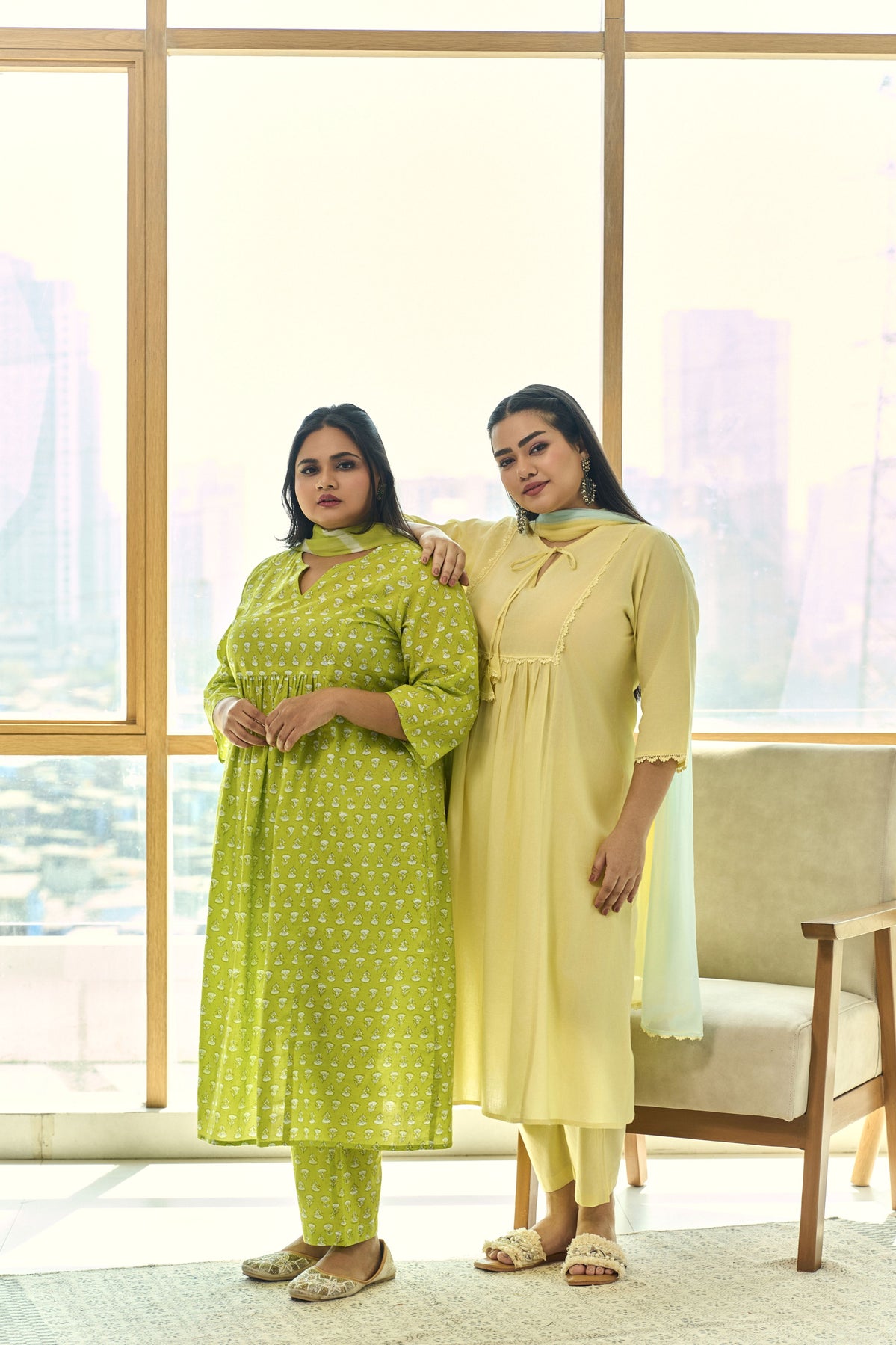 The lime booty Anarkali set and sorbet yellow kurta, with delicate lace detailing, are just what you need to bring fresh energy and effortless charm to your summer wardrobe.