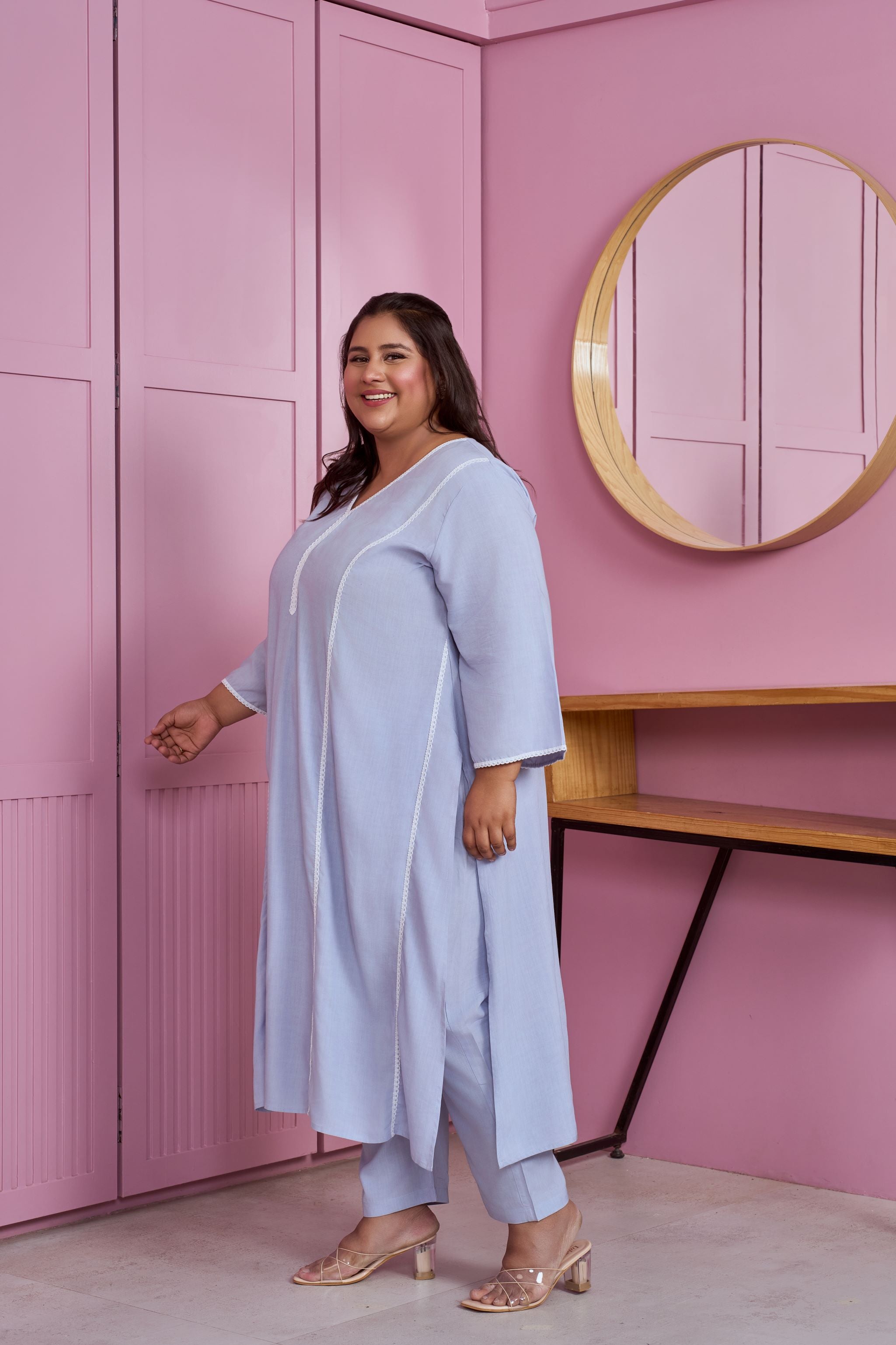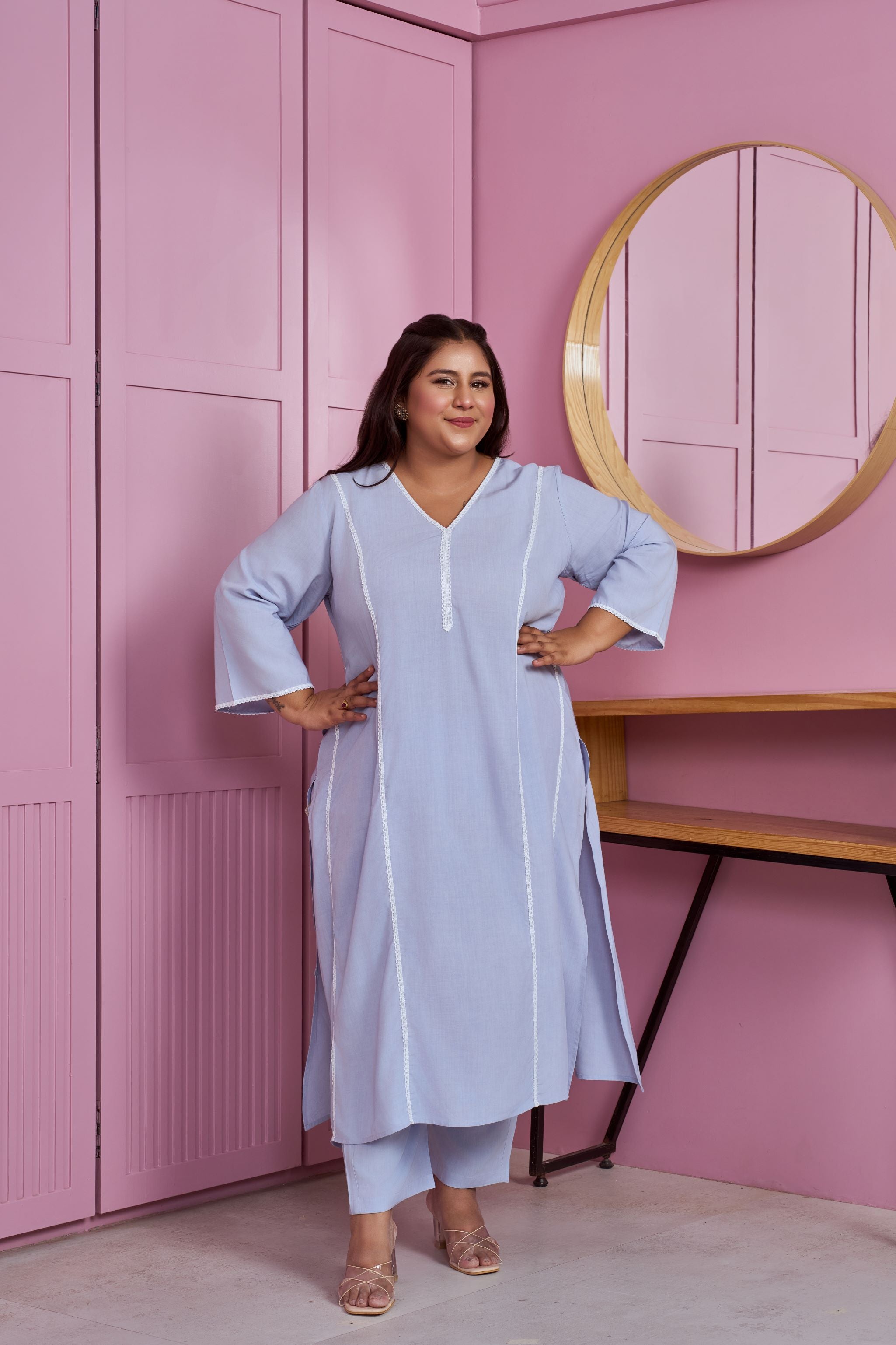 Sky blue cotton short kurta & palazzo set-Plus Size