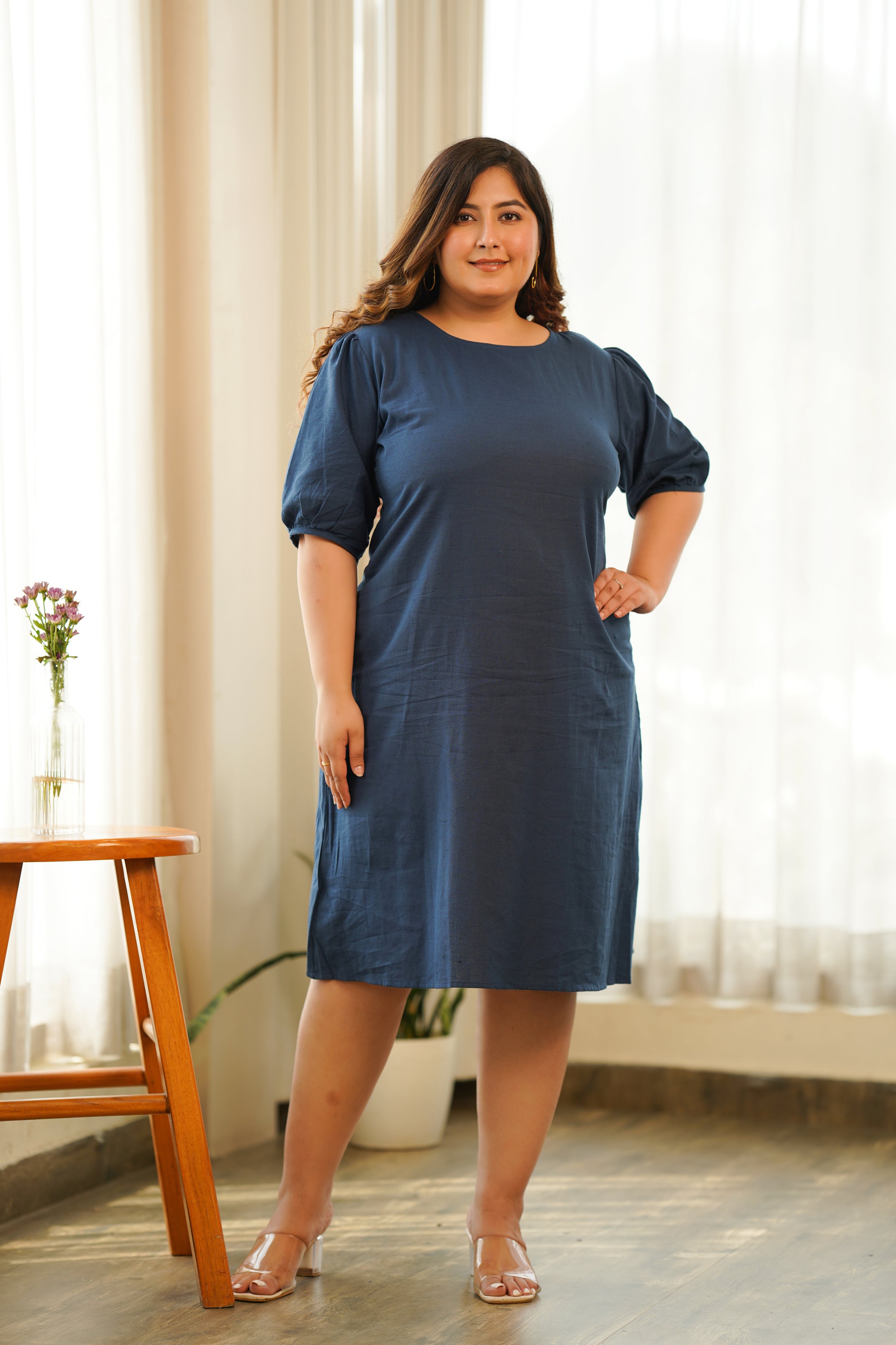 Blue Puff Sleeve Linen Midi DressBlue Puff Sleeve Linen Midi Dress