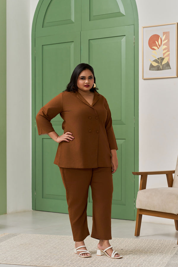 Bossy Mocha Brown Belted Linen Co-ord Set- Jacket Top & Bottom