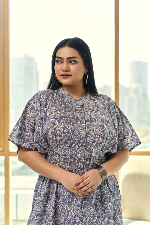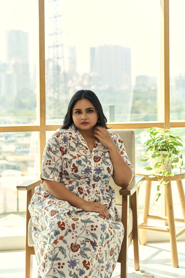 Mocha Brown Ajrakh Print Kantha Cotton Shirt Dress with Belt