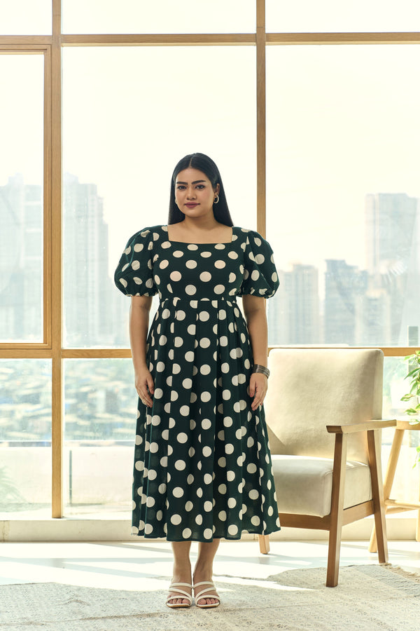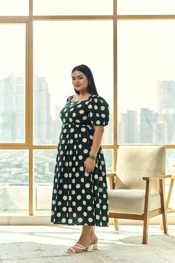 Timeless Polka Dot Green Cotton Maxi Dress with Puff Sleeves