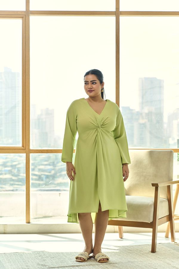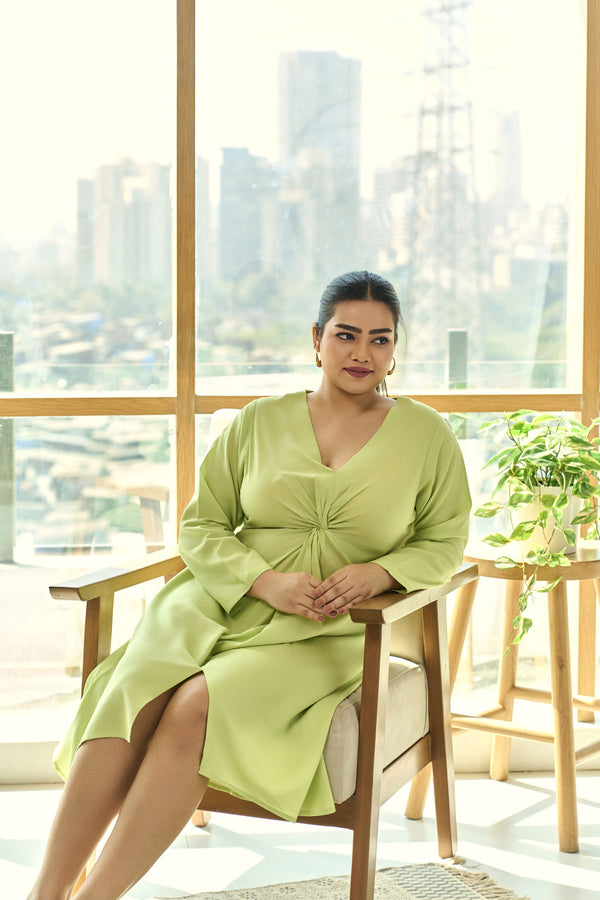 Fuchsia Pink V-Neck Linen Midi Dress with Gathered Waist