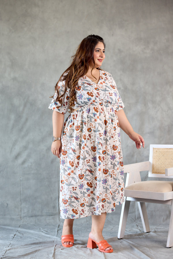 Beige Pleated Floral Cotton Tube Dress – Chic & Elegant