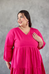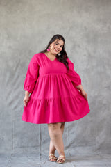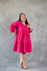 | Channel your inner Barbie with this delightful Barbie Pink Tiered Short Dress in vibrant pink, featuring a flattering v-neck and playful elasticated balloon sleeves—perfect for a fun-filled girls' day out! |