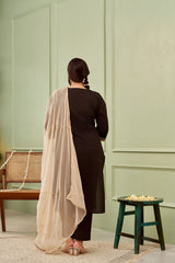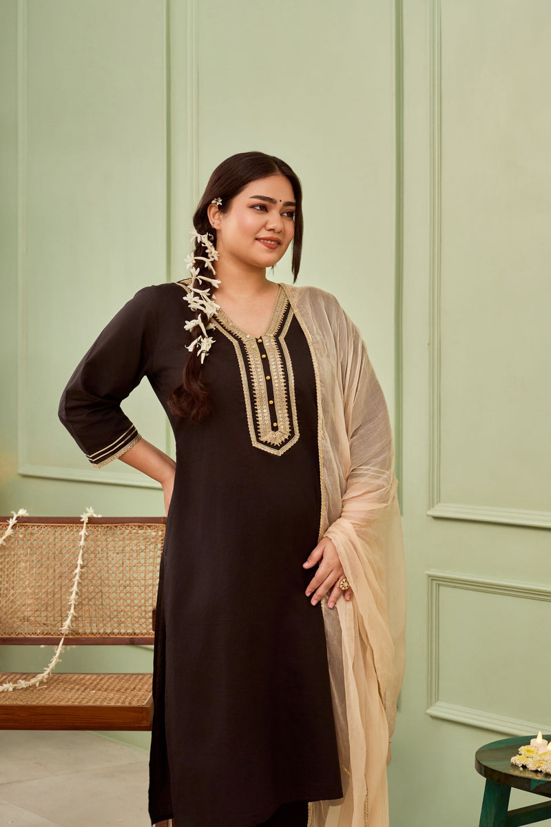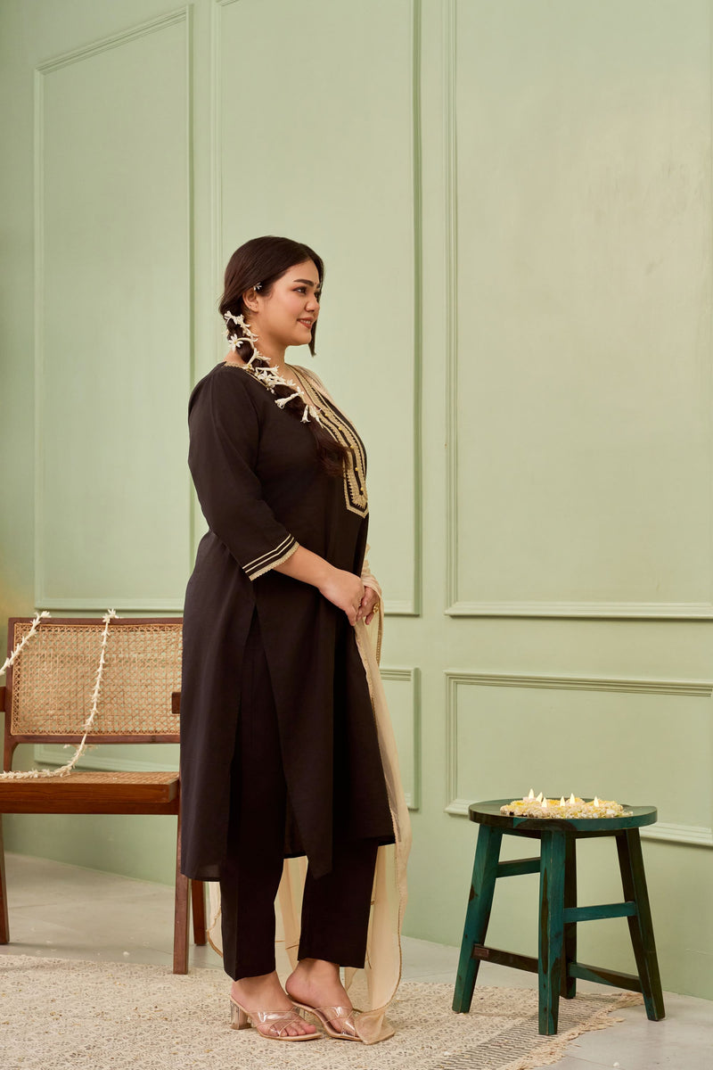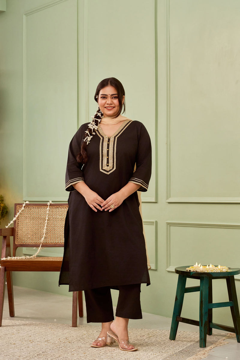 Our Black Cambric Suit Set features stunning gota lace accents and golden buttons, this set is crafted from 100% cotton for a soft, breathable feel. Designed with elegant 3/4th sleeves with golden border, the relaxed solid pants provide effortless movement, while the flowing chiffon dupatta with a shining gold magzi border along with fine gota lines across the width as well, which adds a subtle drama.This versatile piece brings together traditional beauty and contemporary style in one striking outfit.