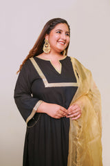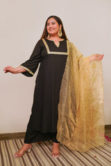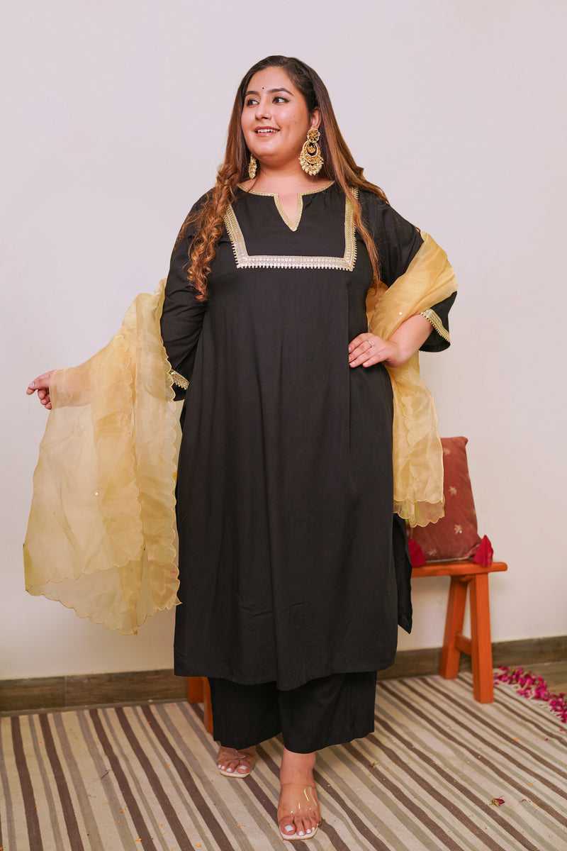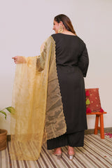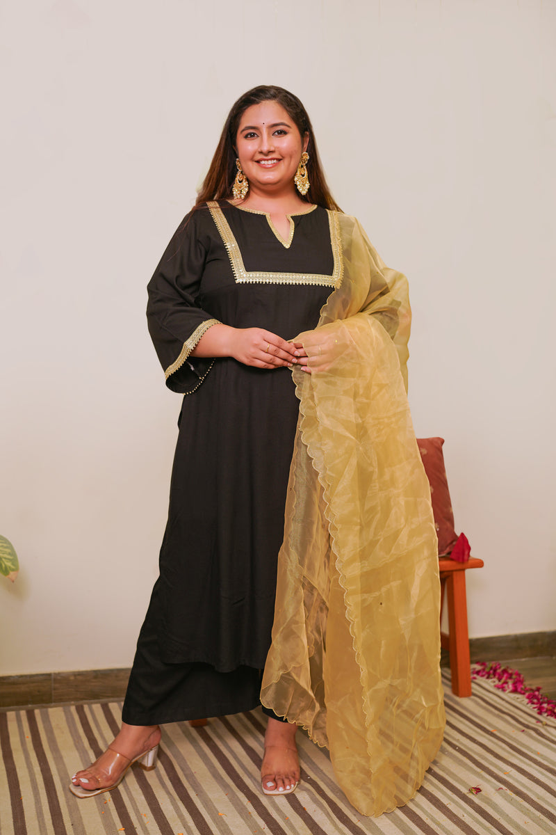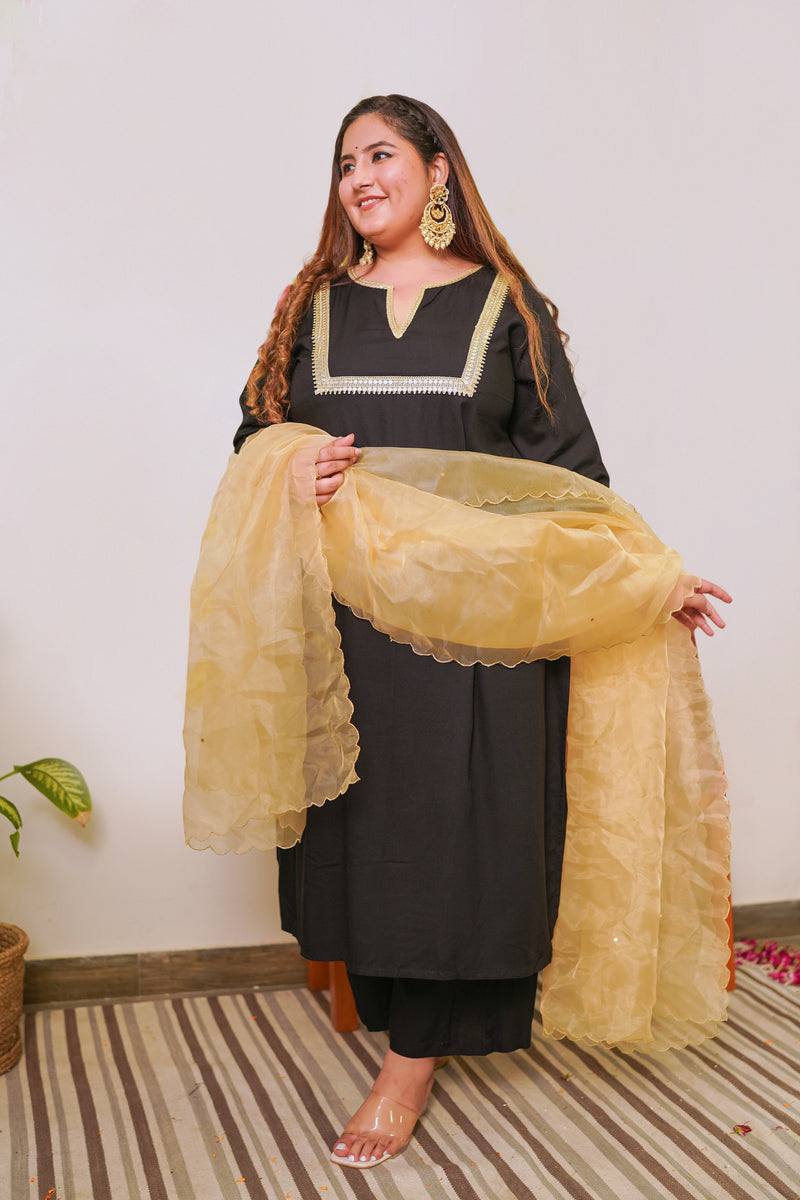 | Embrace elegance in our black suit set. Crafted with finesse, our 3-piece ensemble features a v-neck kurta depicting charming Marori work, a pair of flared palazzo pants, and a stunning organza dupatta. This contemporary fit is ideal for day festivities. The organza dupatta has scallop finishing with teeki all over. |