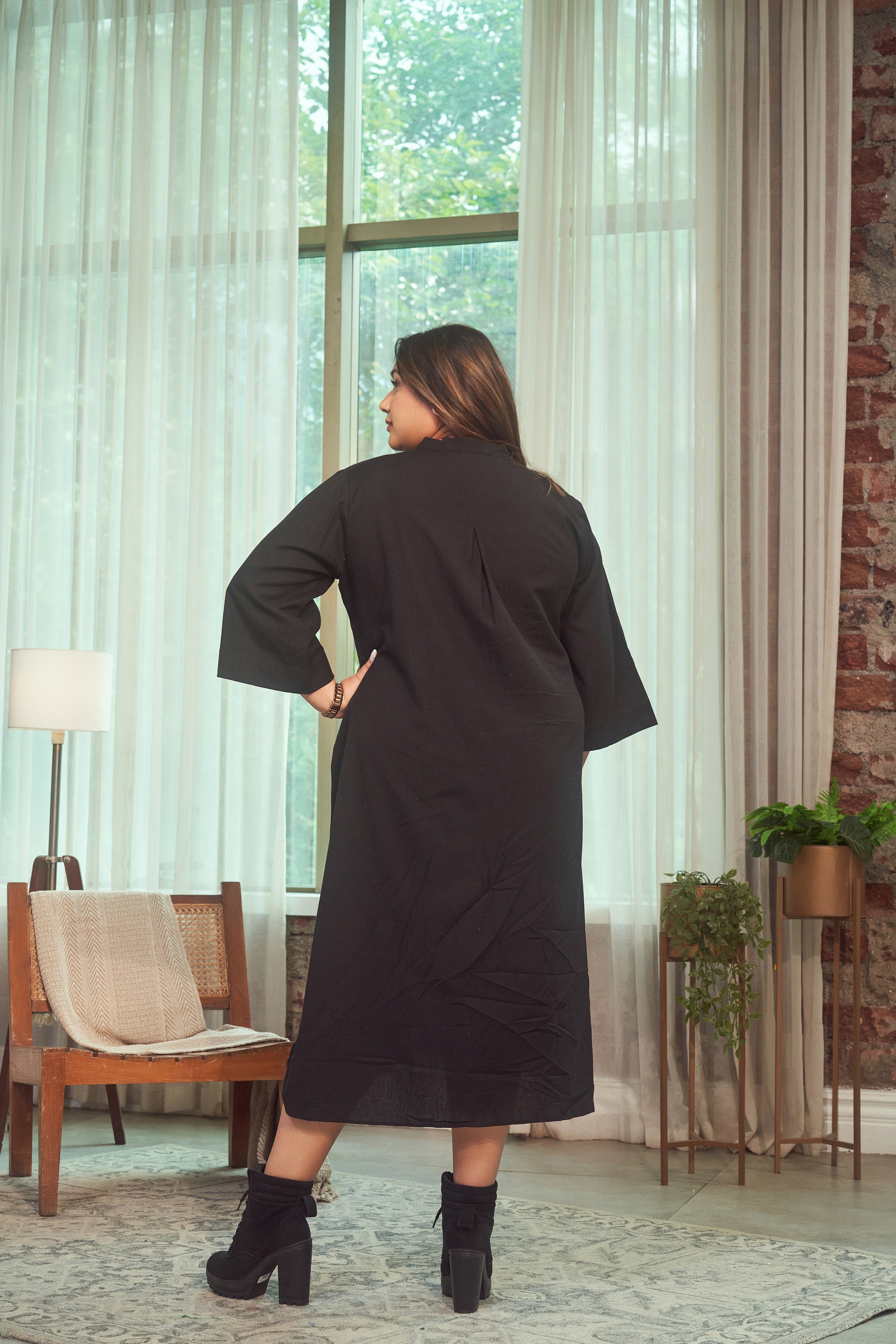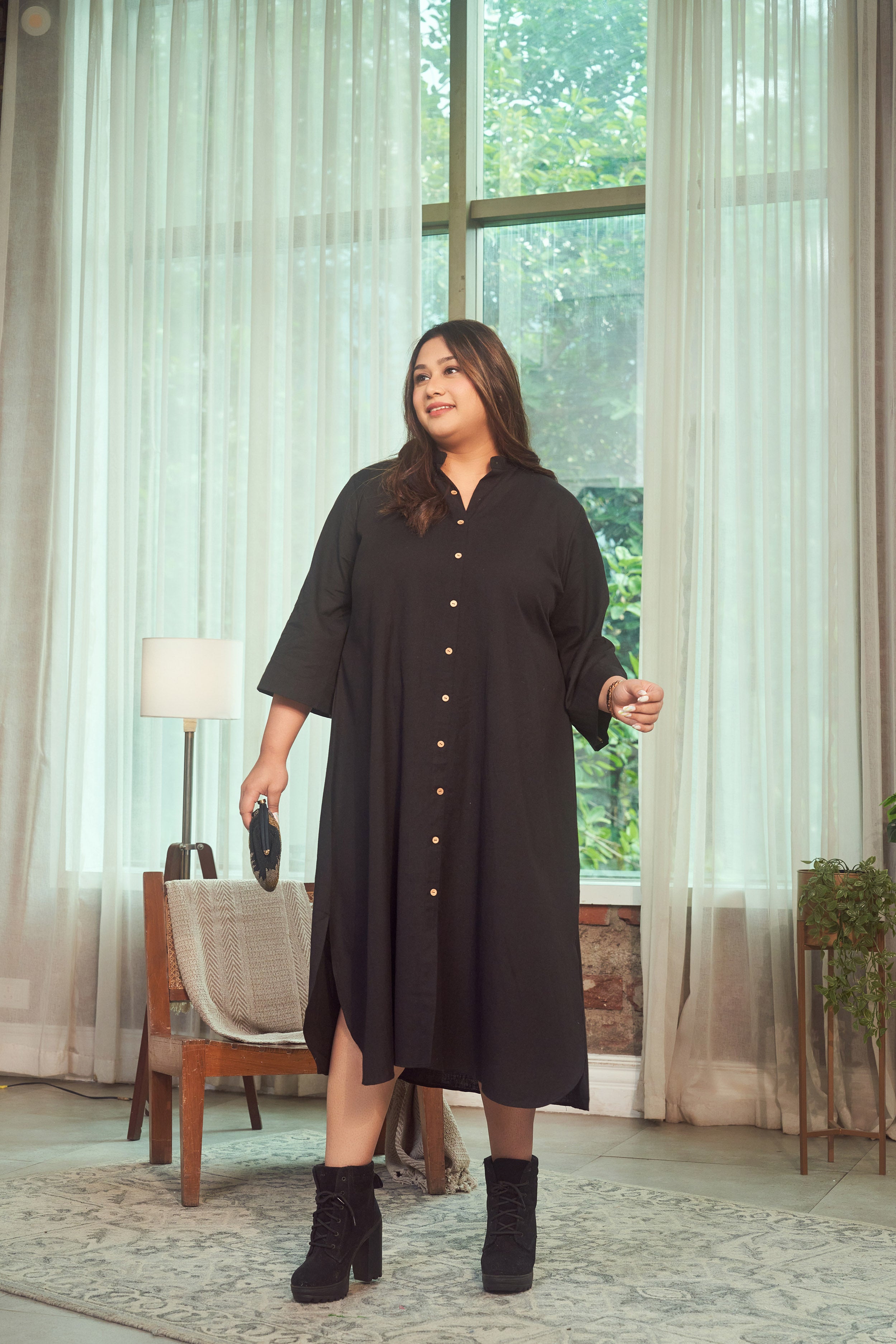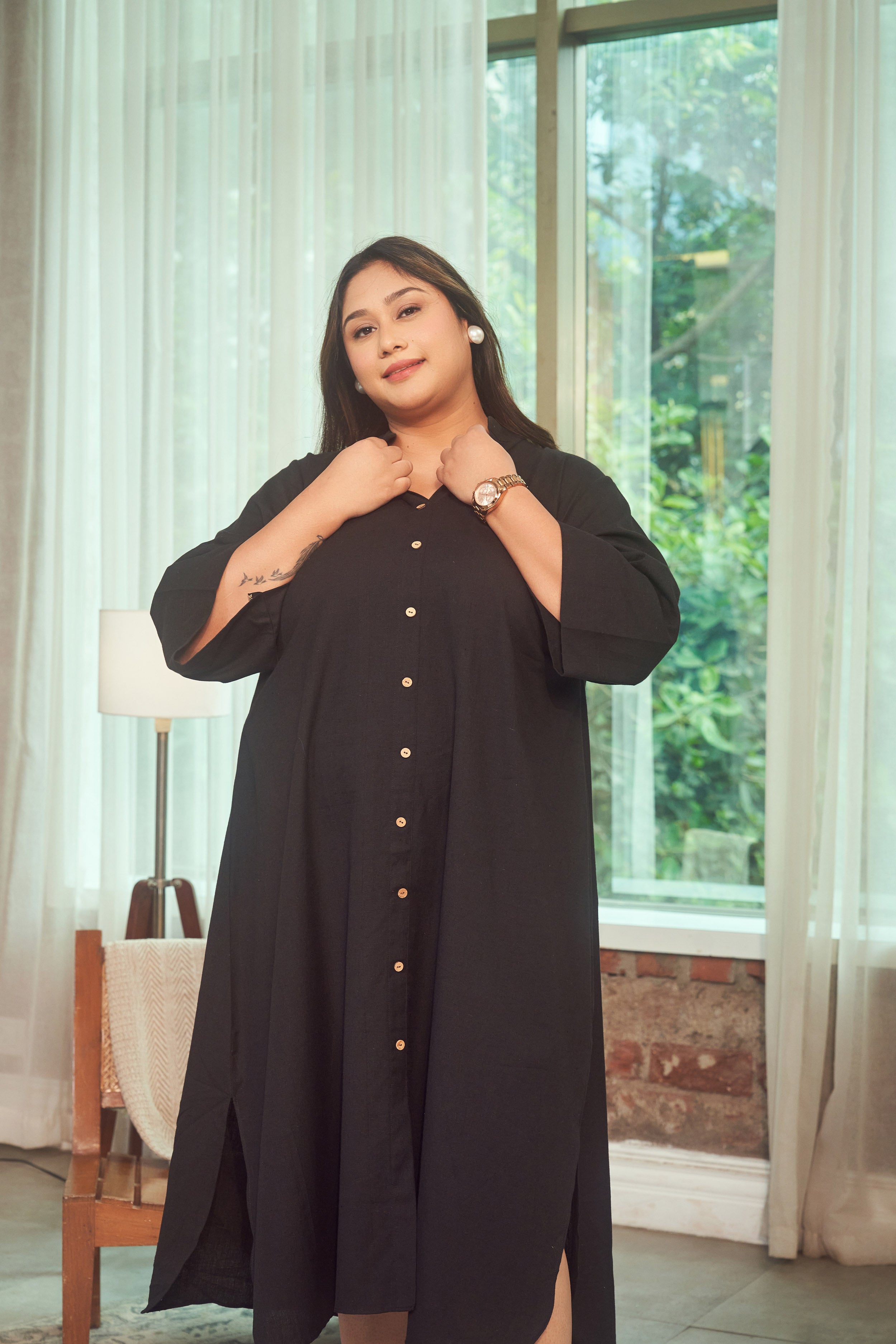 This is a smart button-down dress in cotton flex linen, perfect for work wear. The black cotton dress has an oversized look with low slits, making it comfortable and chic work wear. The buttons are functional and open for utility, ideal for practical work wear. Wear it with flat chappals for a carefree look or with boots to amp up your work wear style. Styling Tip: Layer it inside with top and denims and wear this dress as a shirt |