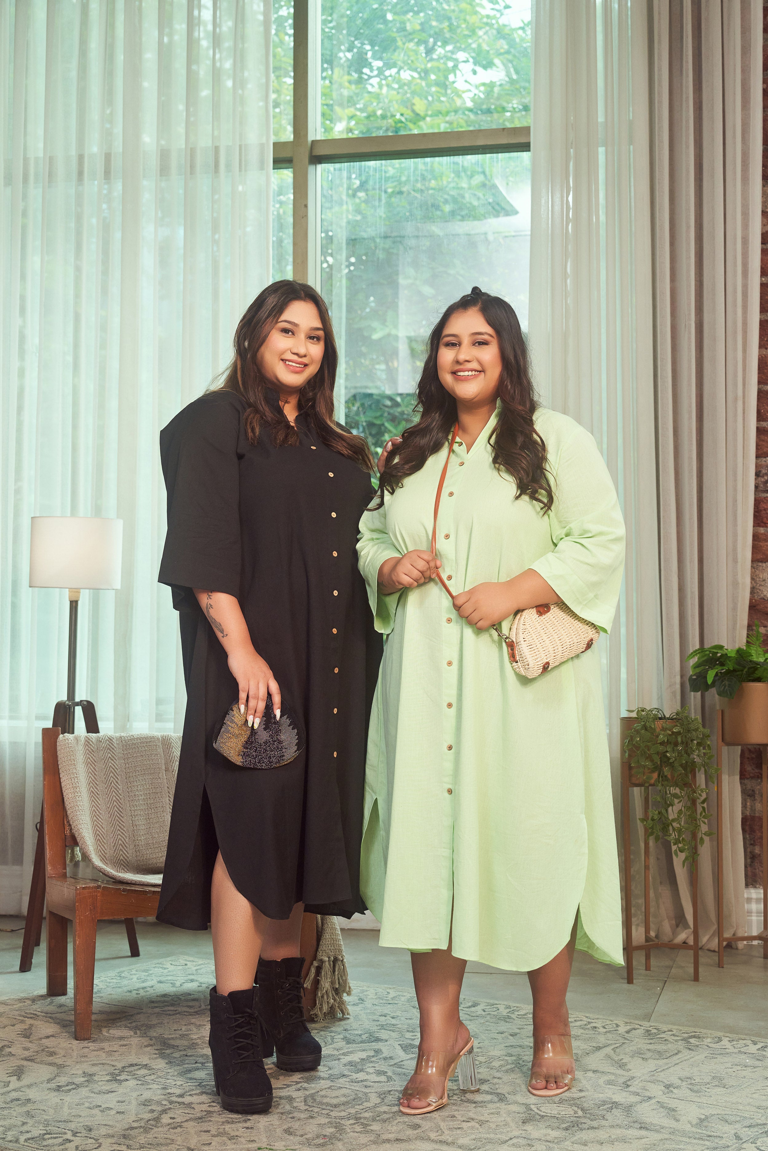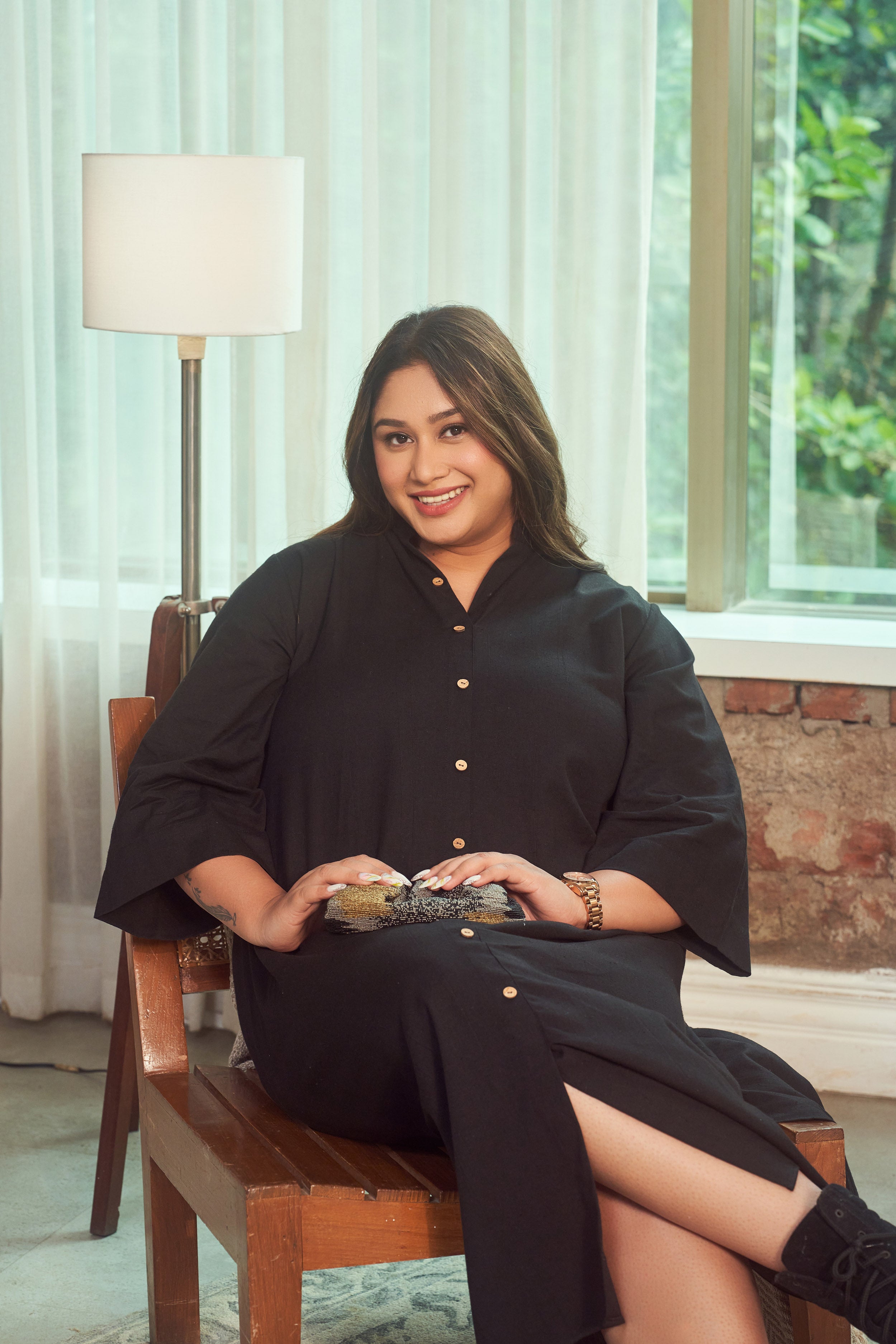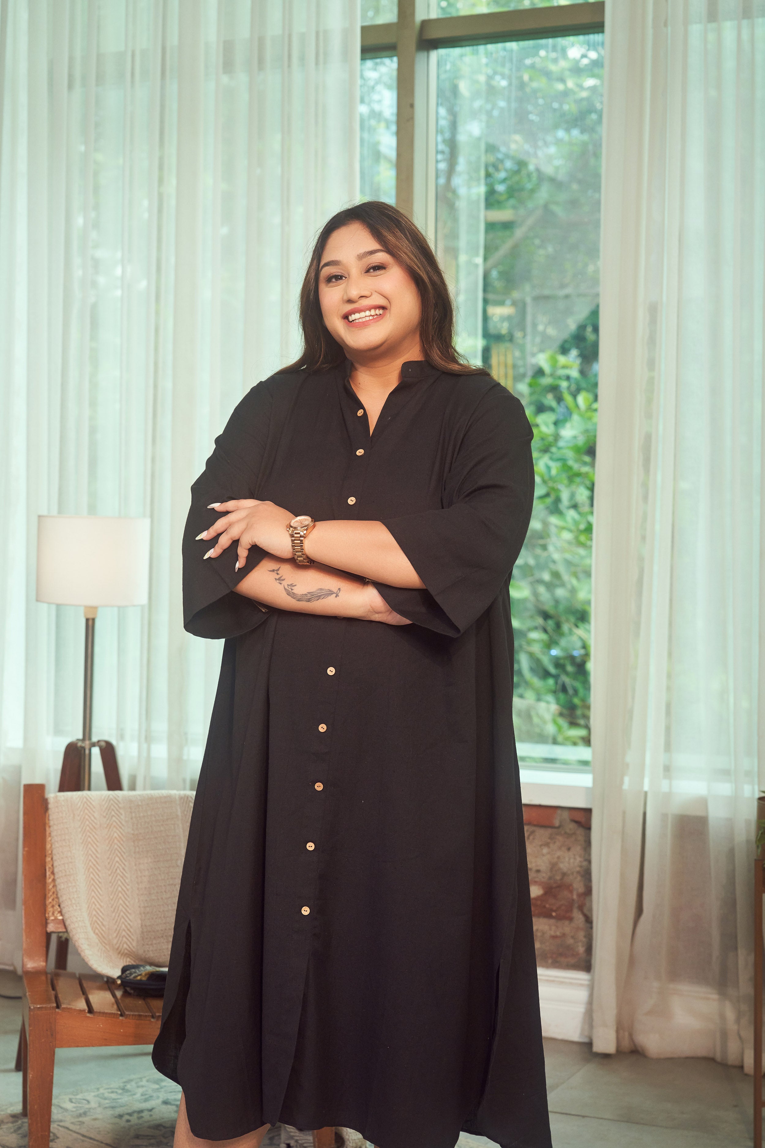 This is a smart button-down dress in cotton flex linen, perfect for work wear. The black cotton dress has an oversized look with low slits, making it comfortable and chic work wear. The buttons are functional and open for utility, ideal for practical work wear. Wear it with flat chappals for a carefree look or with boots to amp up your work wear style. Styling Tip: Layer it inside with top and denims and wear this dress as a shirt |