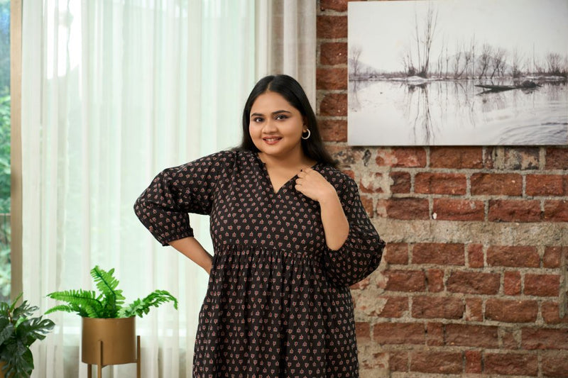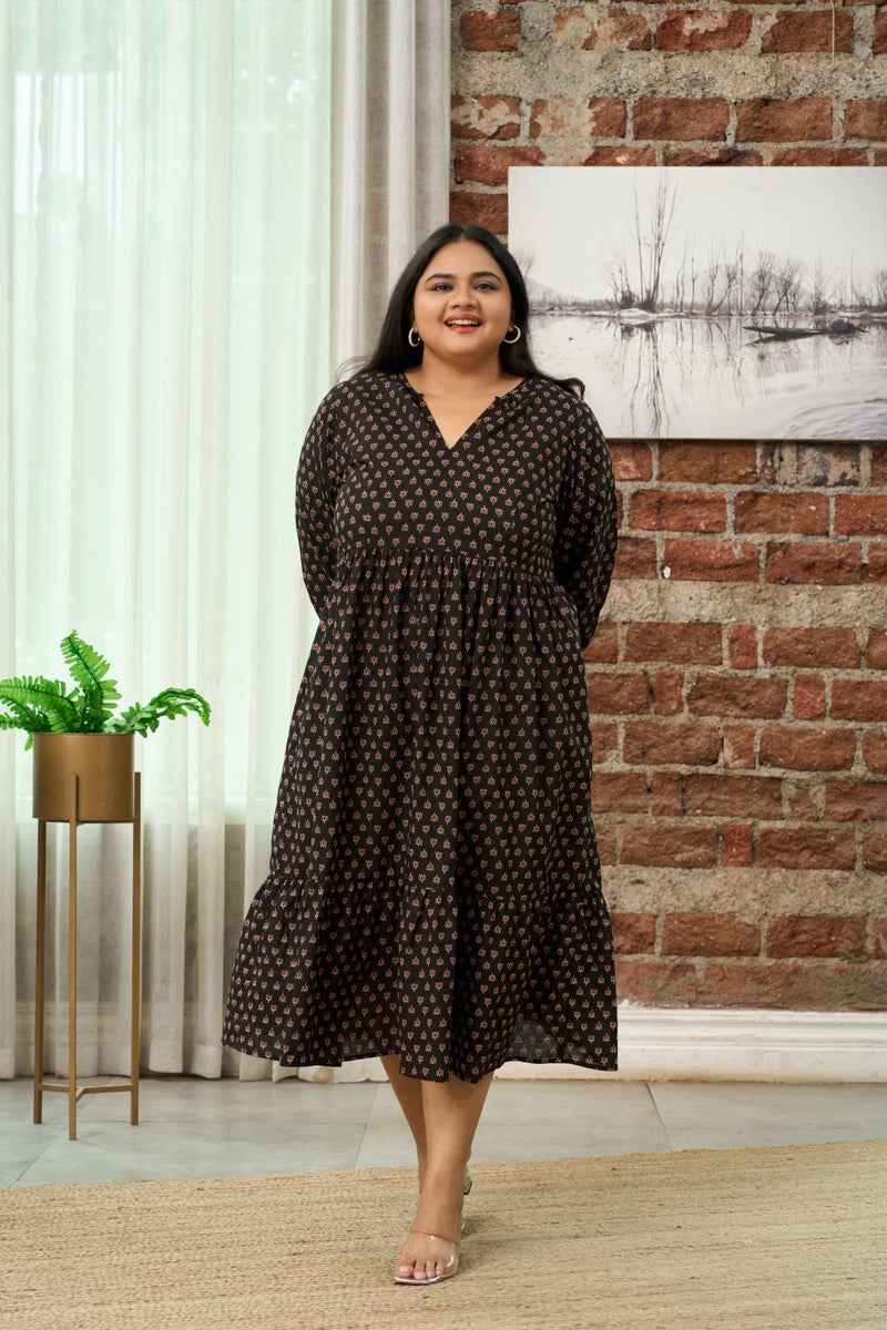 Wrap yourself in timeless elegance with this Bagru Printed Black Cotton Tiered Dress. Crafted from soft, naturally dyed cotton, its split neckline and cascading tiers dance harmoniously with your every move. A masterpiece of traditional artistry, this fit and flare dress is a celebration of comfort and style, whispering stories of India's rich heritage with every wear.