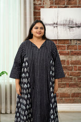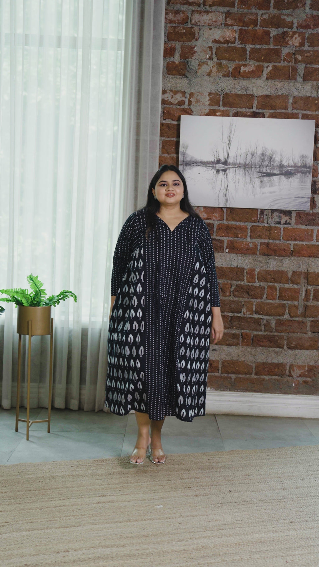 Make a statement with this exquisite Black Maxi Dress adorned with a captivating shibori print. The soft, flowing fabric drapes effortlessly, while the collar neckline and three-quarter sleeves exude classic charm.