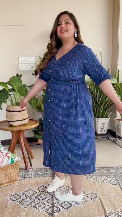 A fusion of contemporary style, crafted from high-quality cotton fabric in a vibrant electric blue hue, this dress features a unique block printed design with a v-neckline. A classic button-down front and flattering tailored silhouette, it's perfect for any occasion. Style Tip - Elevate your outfit by accessorizing with a bold belt and a pair of sneakers. |