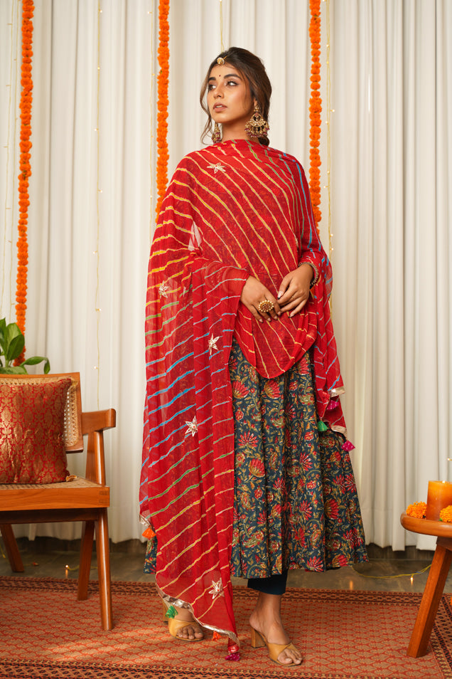 | This beautiful floral printed anarkali set is a three piece set. It has a good fit with concealed zip and good flare. Comes with hand dyed gotta leheriya dupatta for a heavier look. |