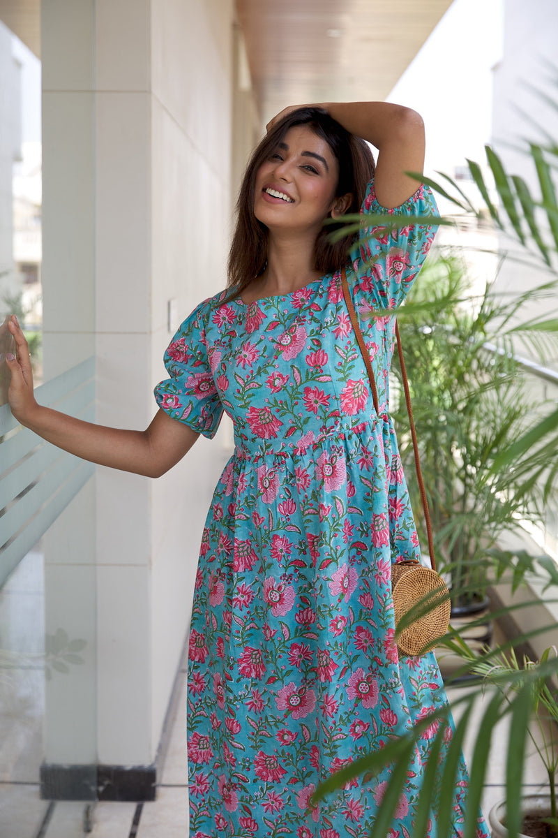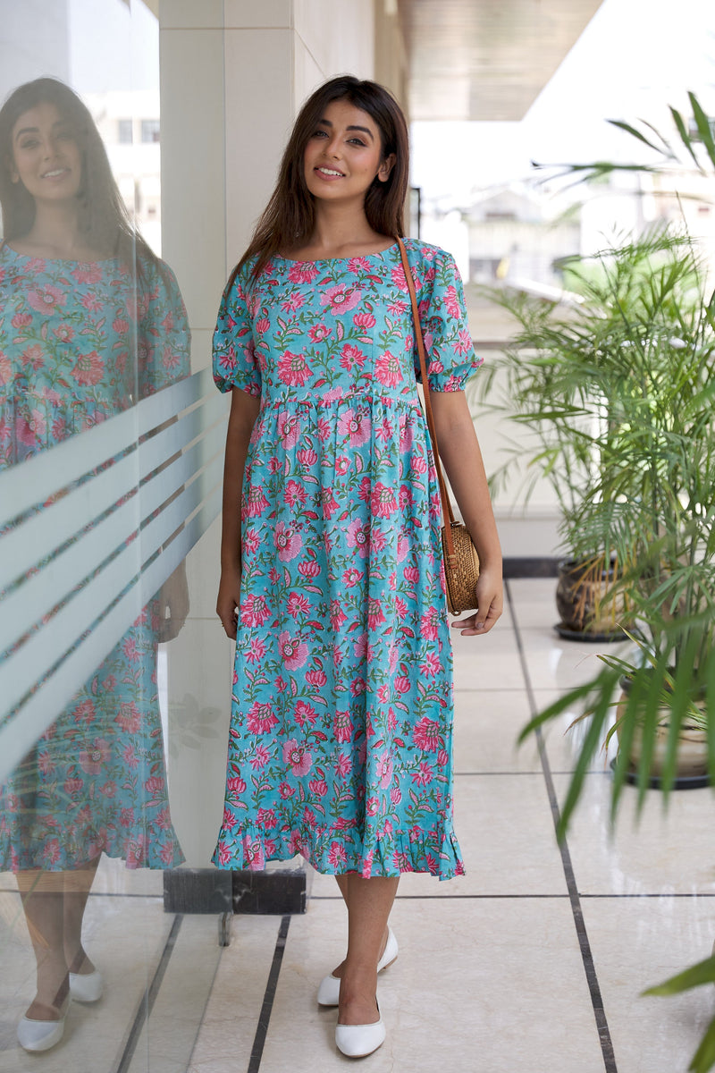 It's a blue floral dress made in 100% hand block printed cotton fabric with a beautiful pleated tier at the bottom and puffy elasticated elbow sleeves making the dress elegant & stylish. This beautiful piece comes featuring big floral print in contrast. This dress is particularly made in Cotton fabric for maximum comfort that makes it a perfect summer wear.