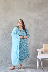 Embrace summery colors with our Blue Floral Printed Kurta Set, perfect for office ethnic wear. This pure cotton kurta features a vibrant floral print, an open neck with dori detailing, and elasticated 3/4th sleeves. Paired with printed trousers and a chiffon dupatta adorned with tassels, it exudes effortless elegance for any formal outing.