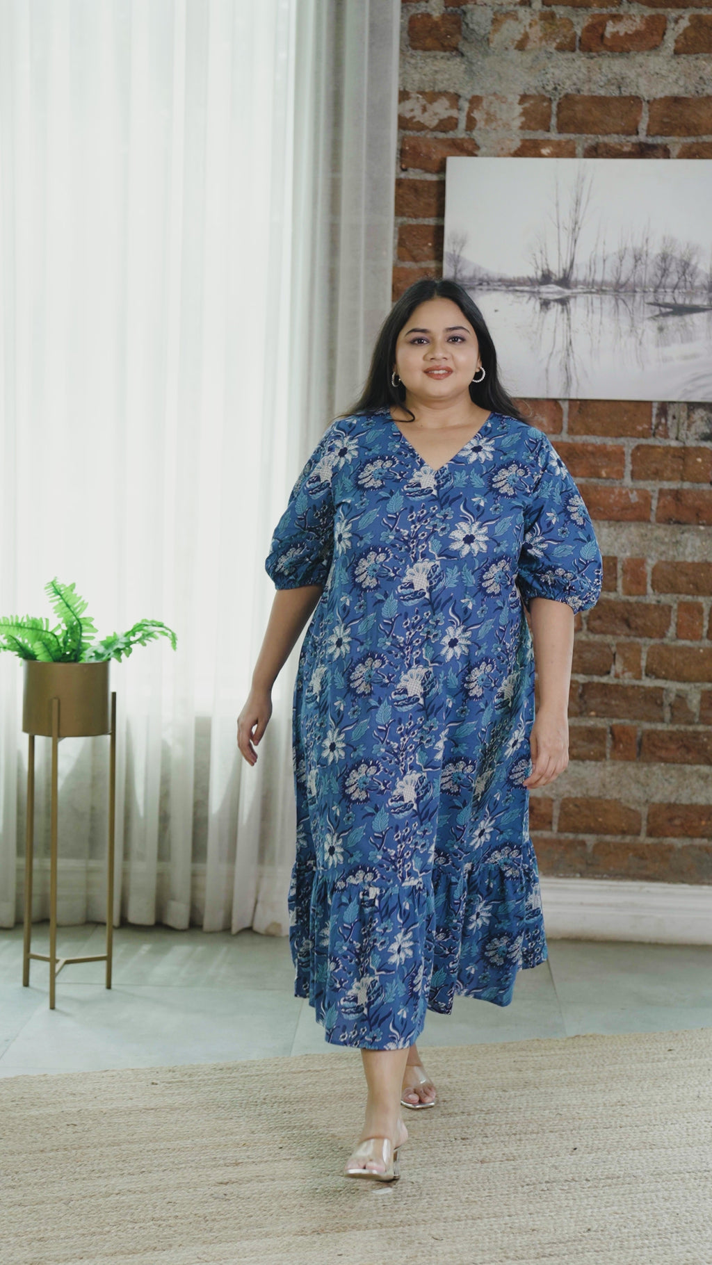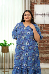 Elevate your everyday style with a breezy Blue Floral Maxi Dress. Crafted from 100% pure cotton, this A-line dress features a flattering V-neckline, comfortable elasticated elbow sleeves, and a flowing flared hem for effortless chic.