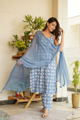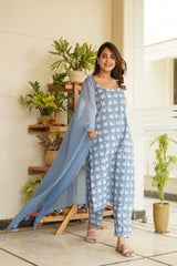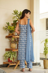 Blue Floral Strap Cotton Kurta (Set of 3)