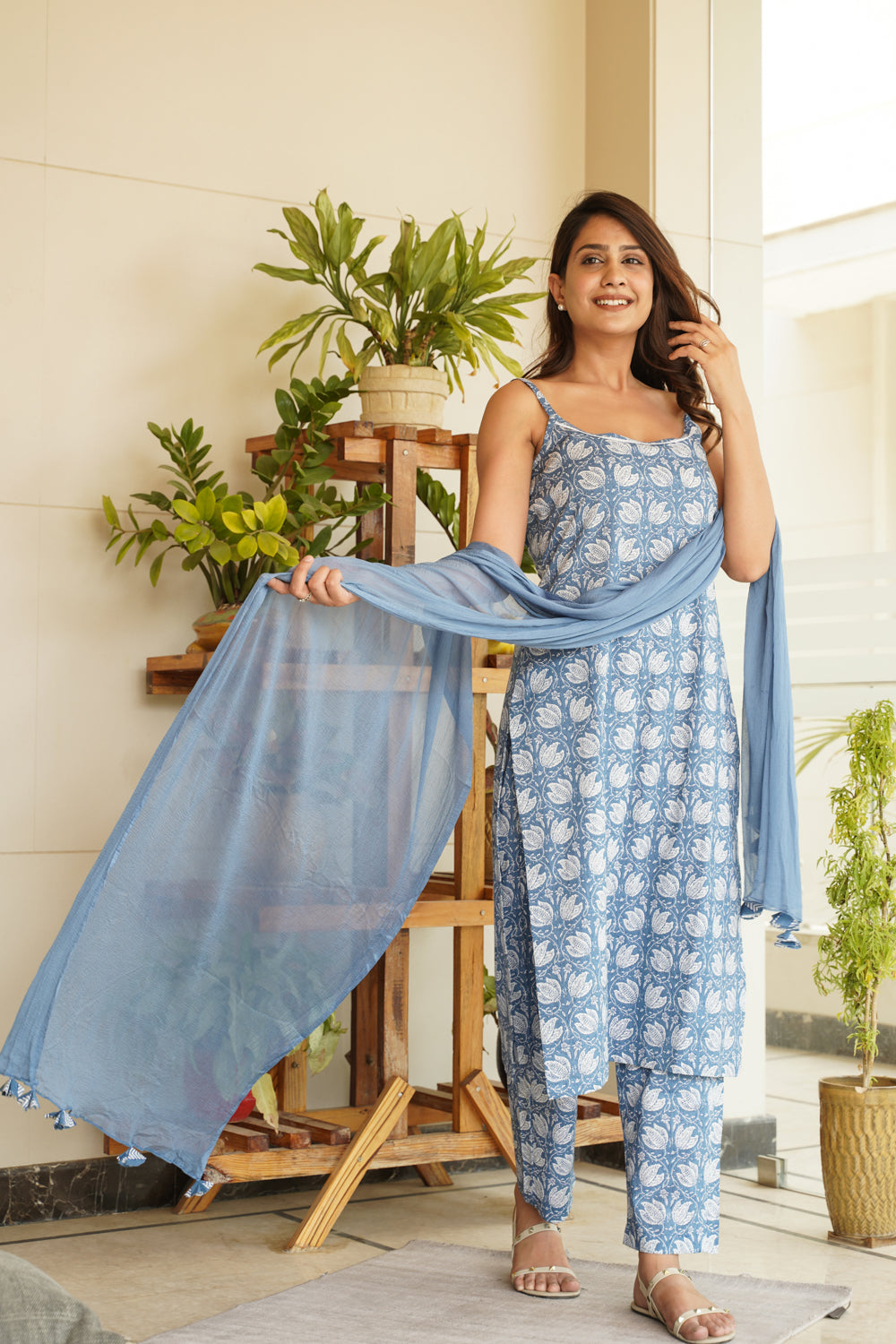 Blue Floral Strap Cotton Kurta (Set of 3)