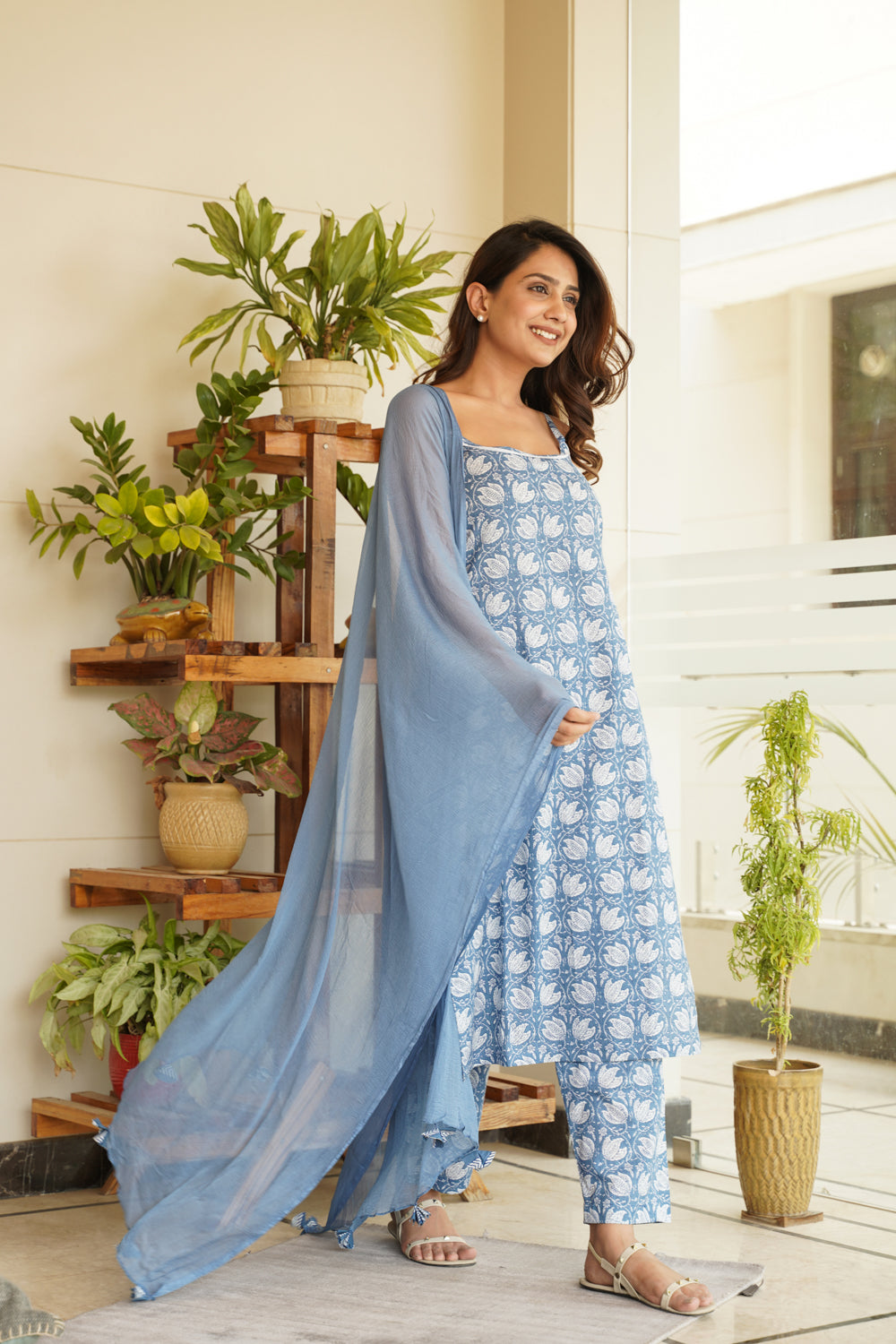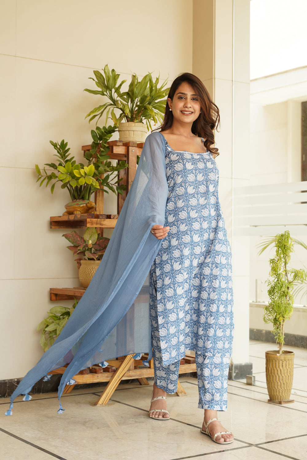 Create a fresh casual look with our blue floral 3-piece kurta set. The pretty floral print in white create a cheerful vibe. This amazing calf-length, square neck strap kurta with side slit comes in 100% cotton material for everyday use, comes along with a matching cotton pants and chiffon dupatta which has pretty cute tassels on it.