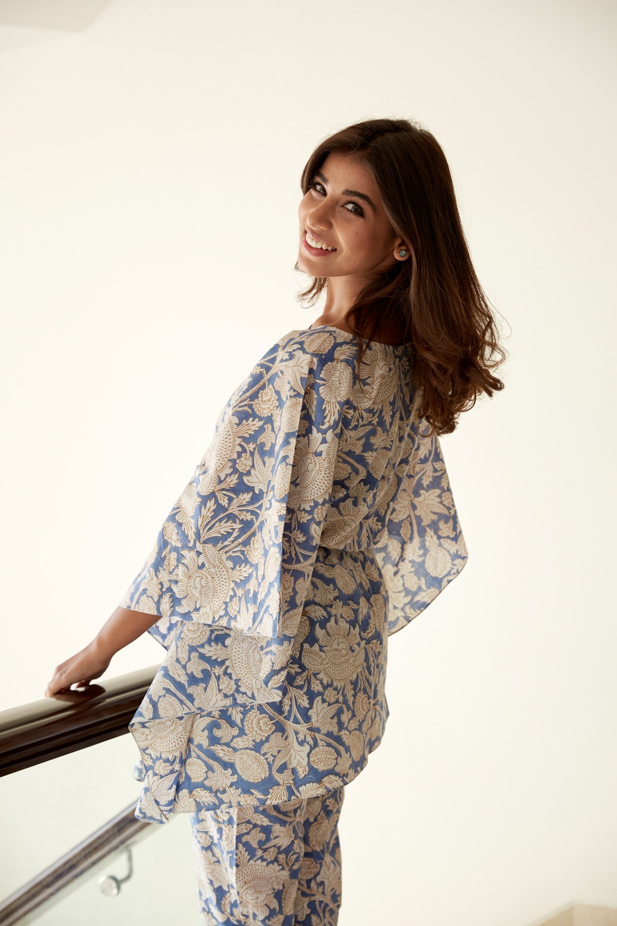 This lounge set is comfy with kimono sleeves and the same print pants. Comes with a tan belt to accentuate the look for a day outing too.