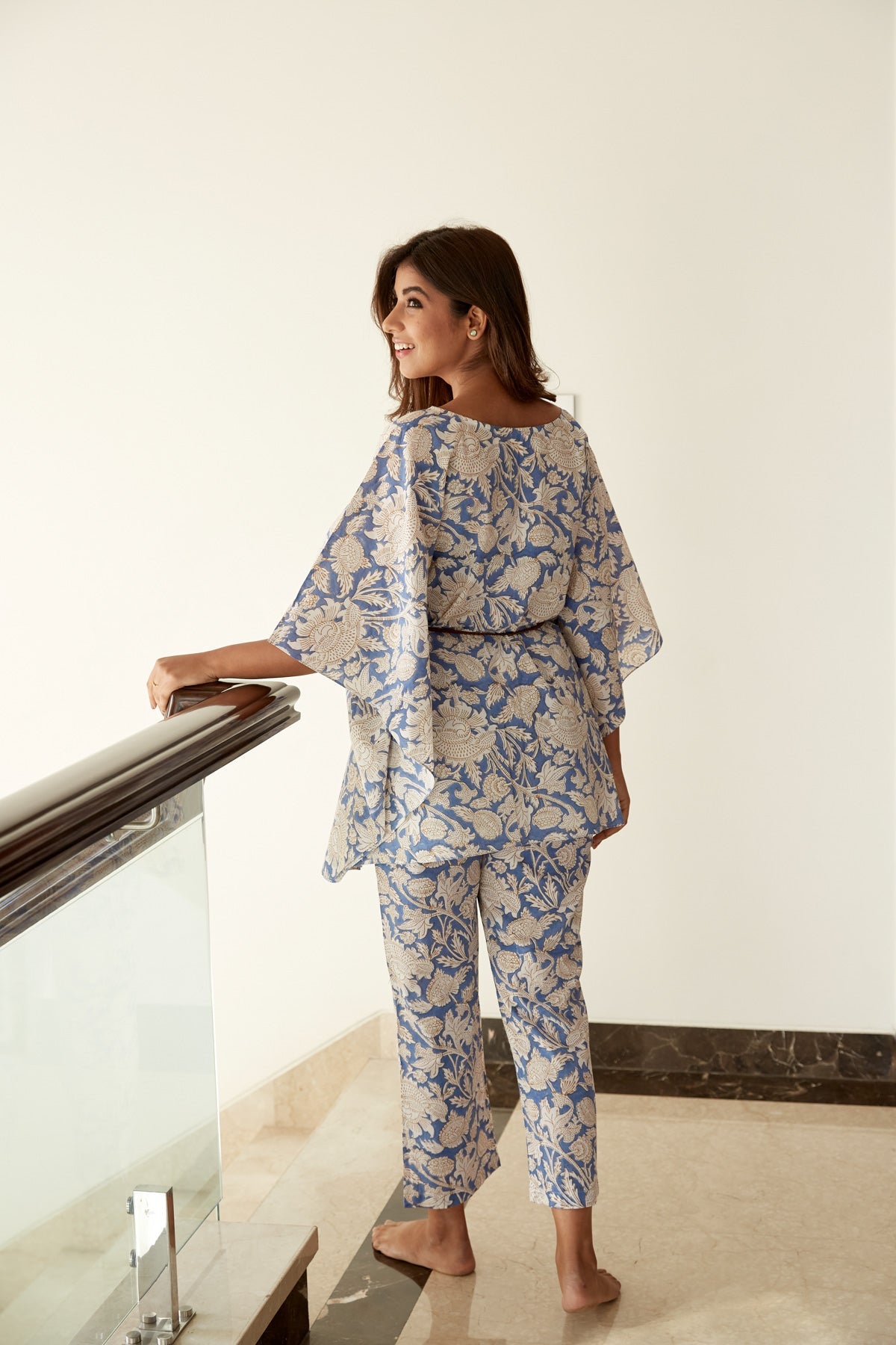 This is a two piece set in 100% cotton floral hand block print with kaftan look pattern with same print pants. The tan leather belt is also included in the set.