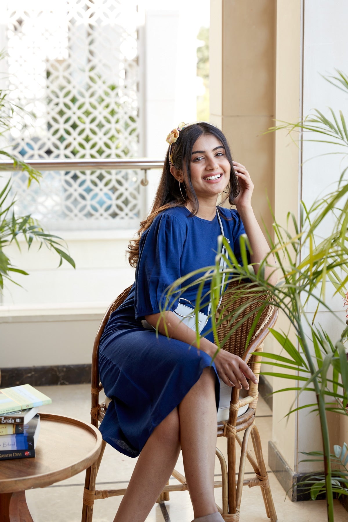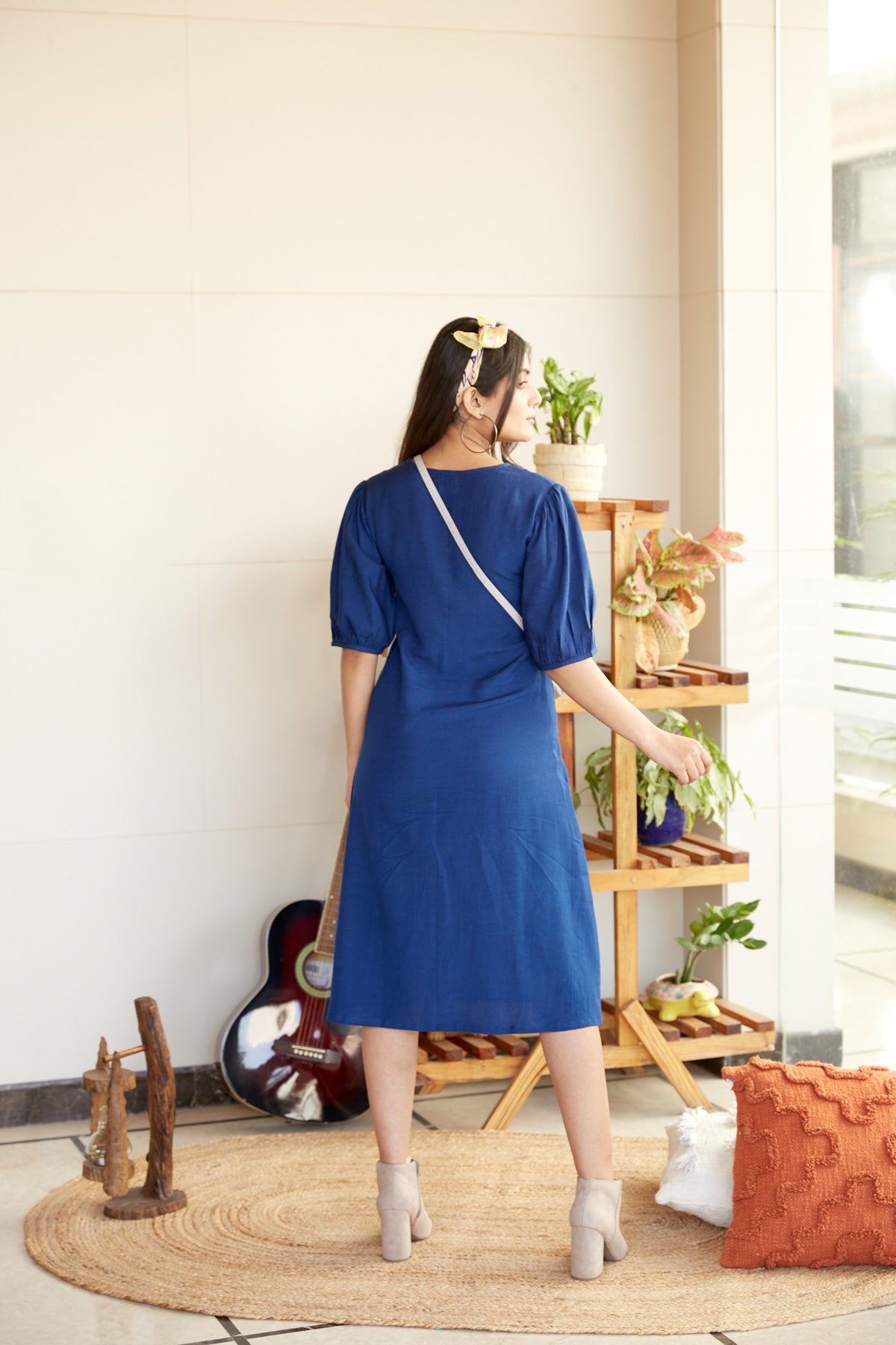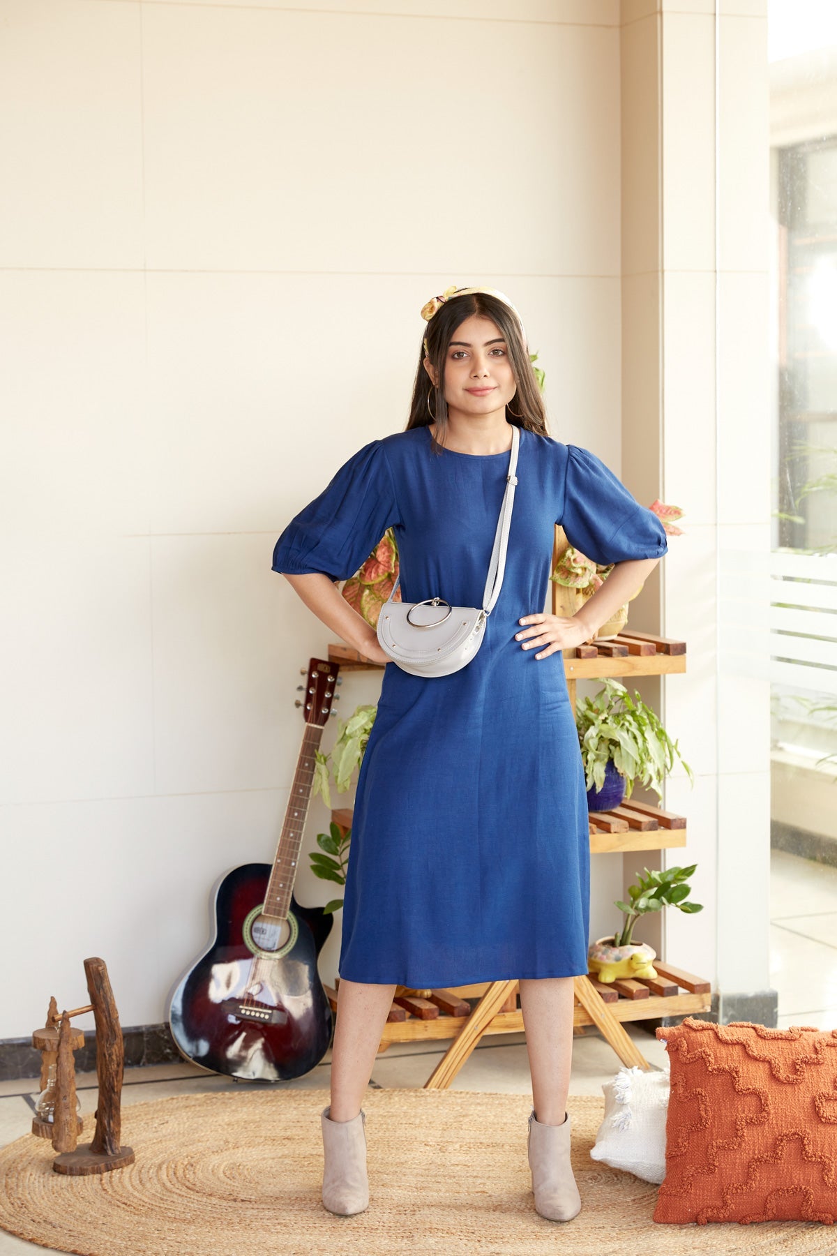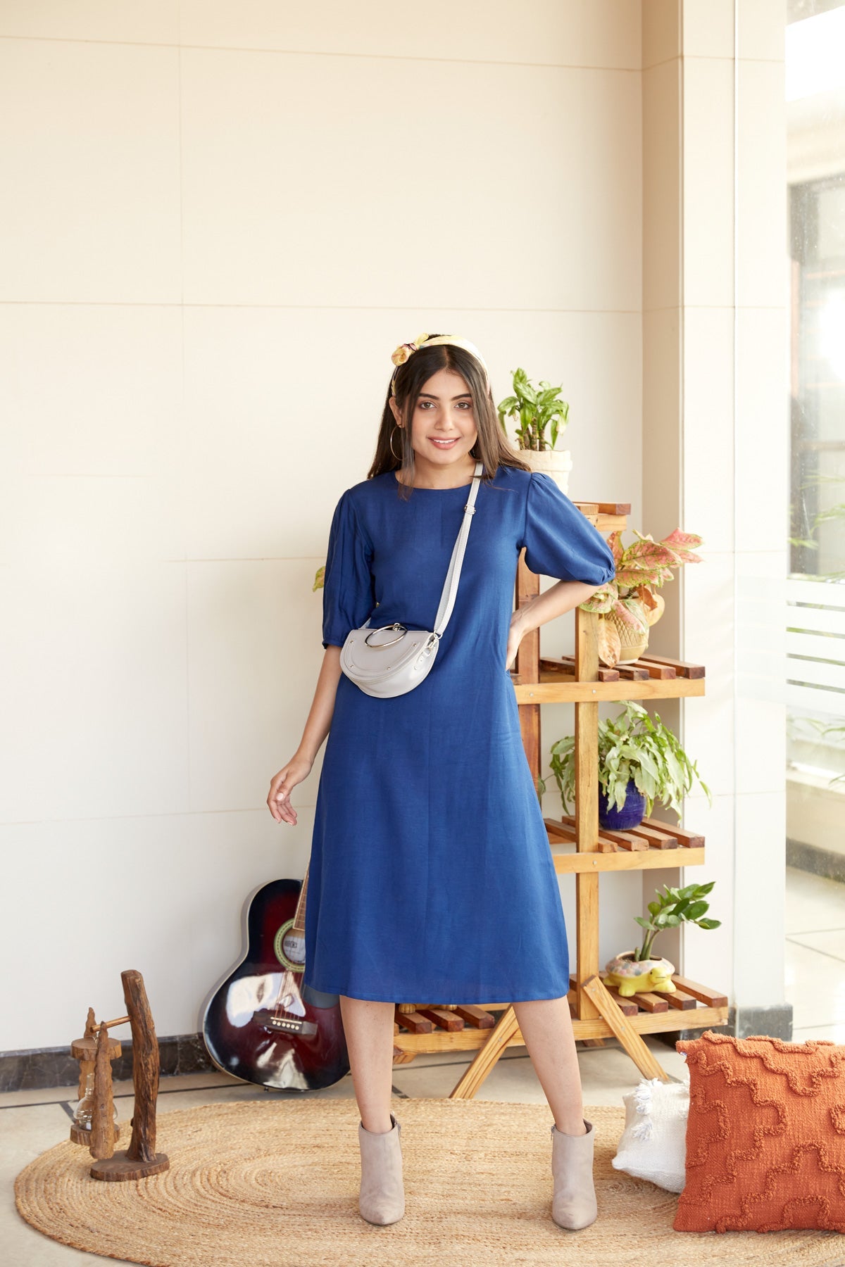 It's a blue straight midi dress in flex with puffed sleeves and a bit straight look. This dress will make anyone look pretty on any occasion. It has a unique silhouette which is comfortable and easy to carry. It's classic for any formal and party look.