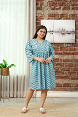 Bohemian Teal Print Midi Dress with Gathered Waist