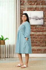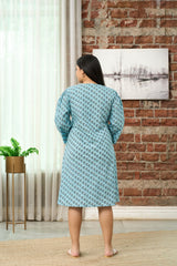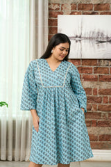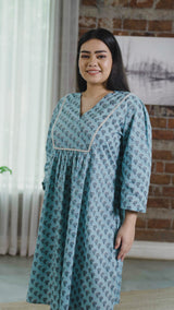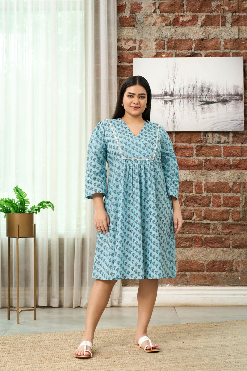 Channel your inner bohemian with this Teal Midi Dress. Its flowing knee-length silhouette, adorned with a whimsical booti print and delicate crochet lace. The gathered waist accentuates your figure, while the three-quarter sleeves and v-neckline offer comfort and style.It’s ideal for casual outings and has a handy side pocket!