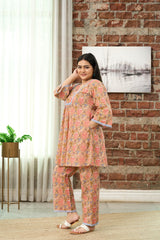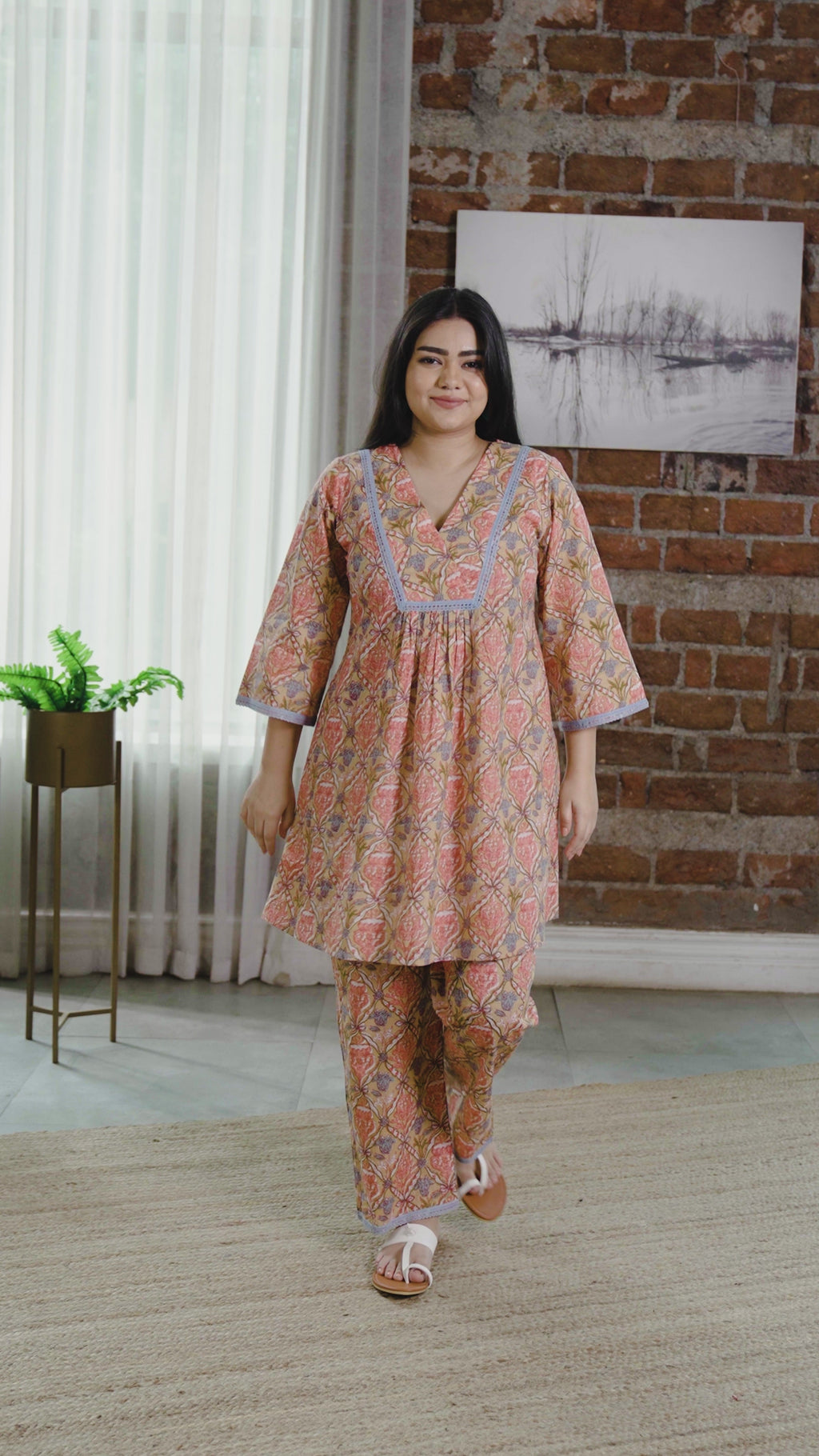 Embrace bohemian chic with our Floral Co-ord Set. The flared, three-quarter sleeve top boasts a V-neckline highlighted with blue crochet lace detailing, while the coordinating straight-leg trousers provide effortless elegance and has a practical side pocket. Ideal for any occasion.