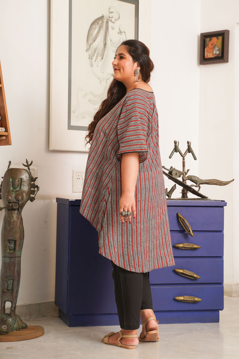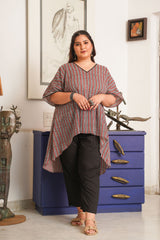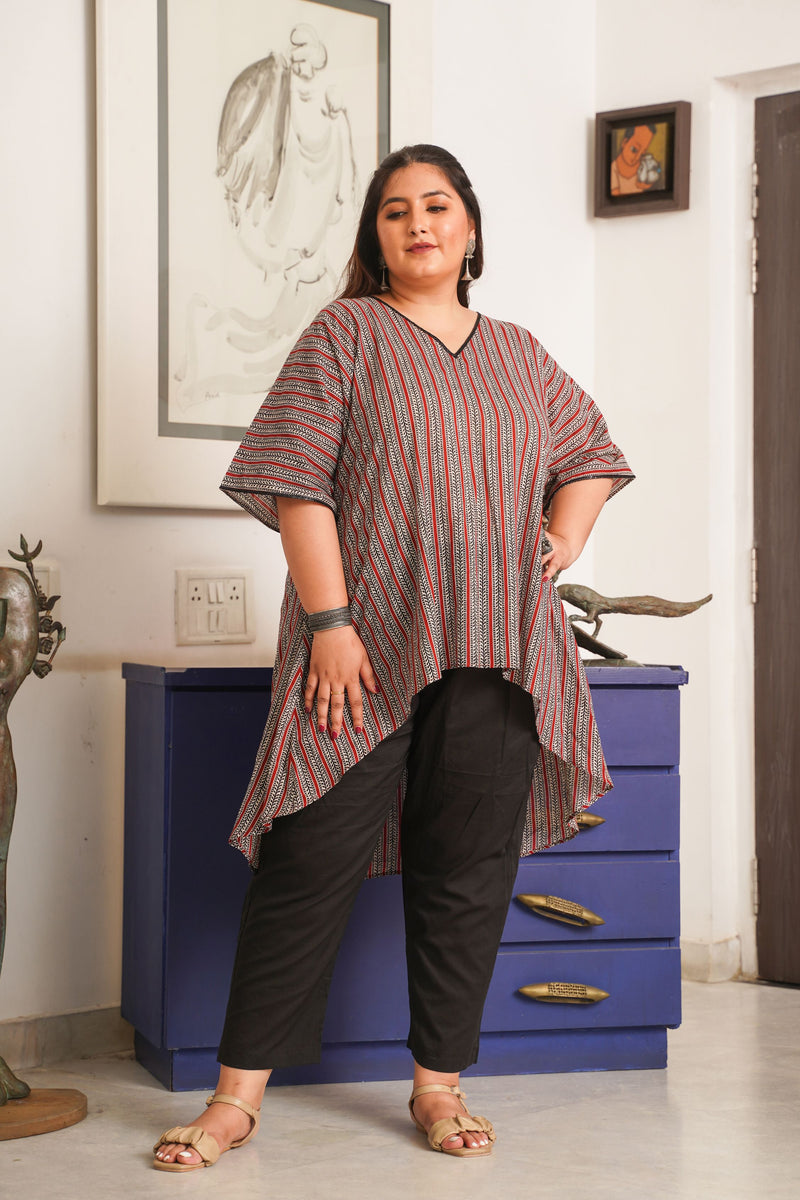 | This is a boho stripes anti fit top with kaftan sleeves. Classic deep shades tops are always an addition to your wardrobe!! Comes with black cotton comfortable pants. |