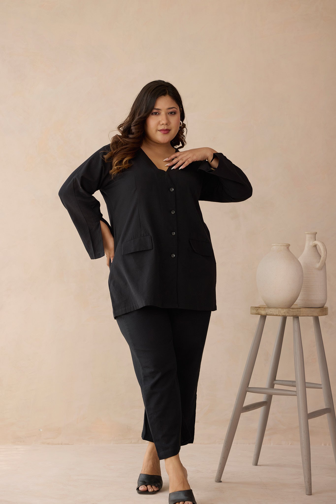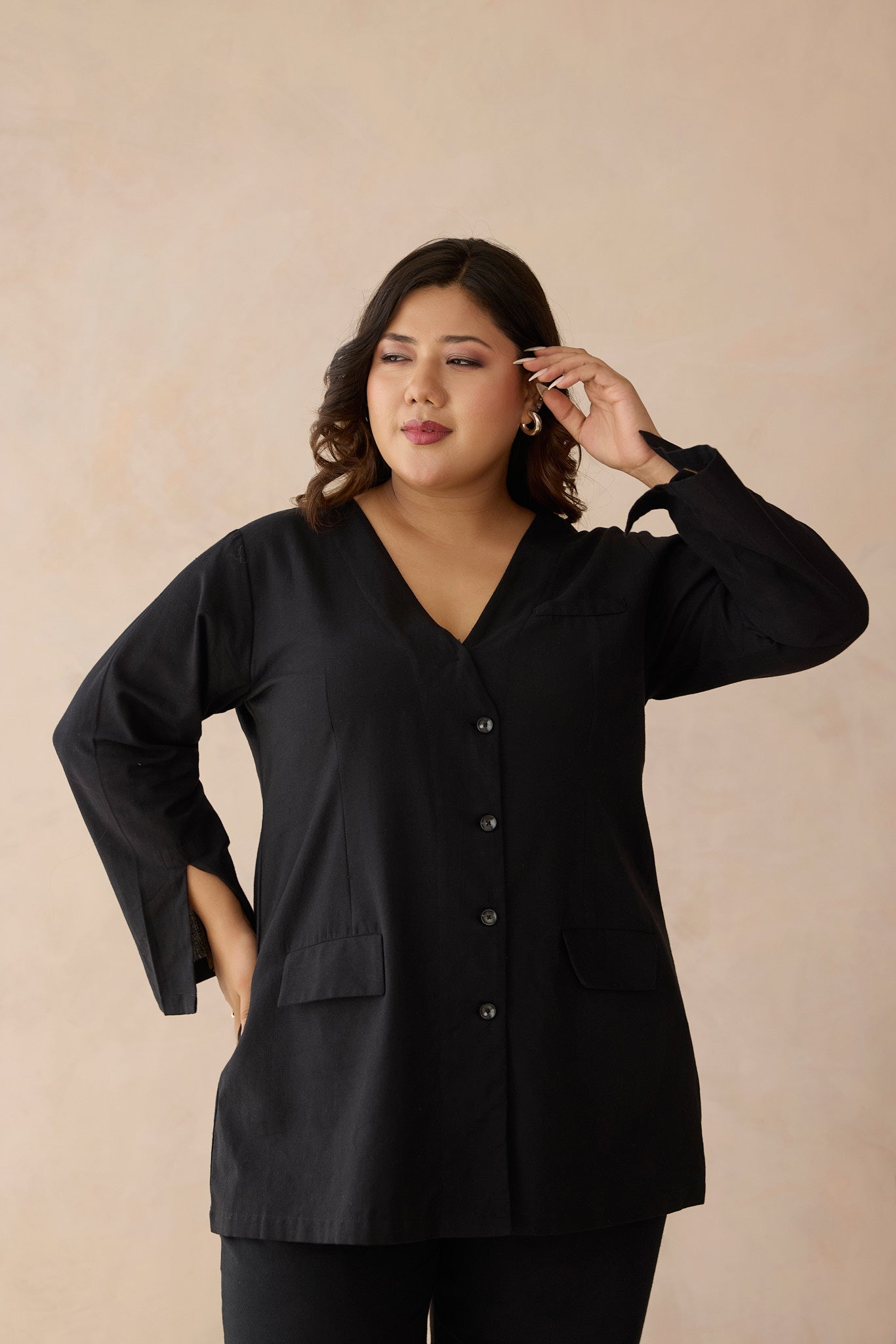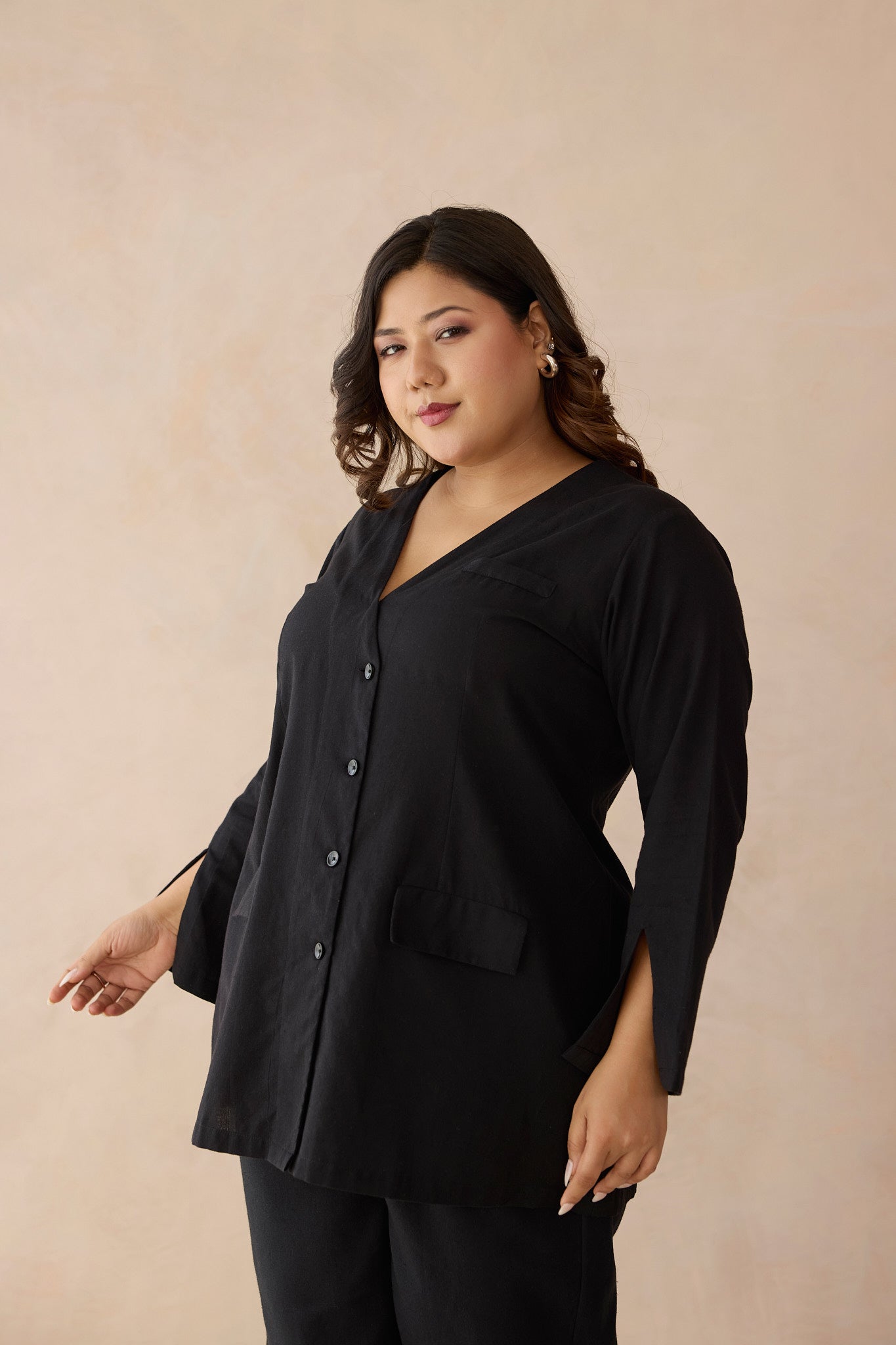 Power starts with how you dress, and this blazer style shirt commands attention from the moment you walk in. Crafted from breathable cotton linen fabric, is designed to keep up with your hustle in style. The blazer-style top features a clean V-neckline, openable buttons, and striking slit bell sleeves, adding movement and confidence to every step. This jacket is a go-to for work meetings, power lunches, or days when you want to look sharp and feel unstoppable.