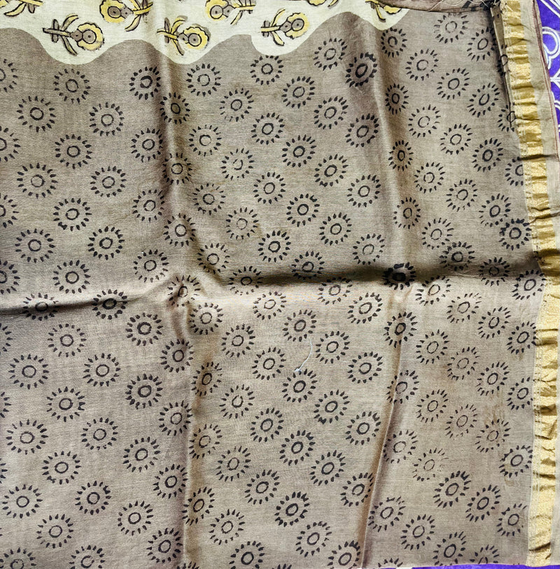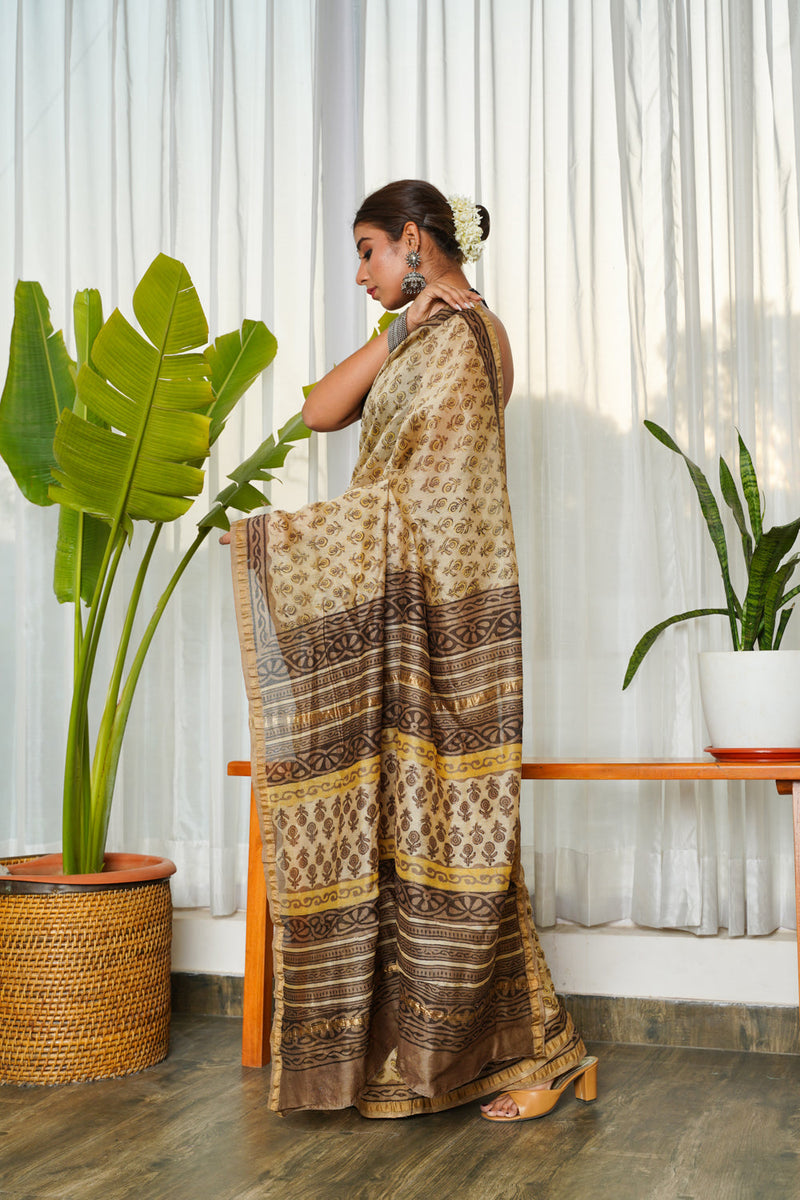 Brown-Beige Ajrakh Printed Chanderi Saree