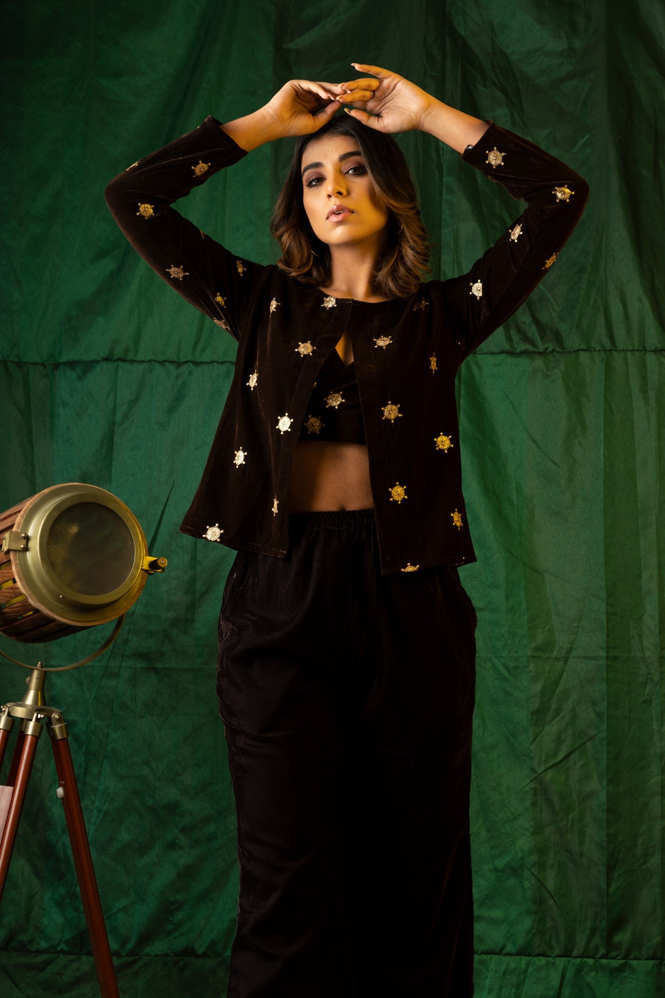 This is a beautiful embroidered Brown Jacket with gold embroidery. The jacket can be worn on sarees or any top or a bralet. So amp up your style quotient!! It will be a good Indo-Western look.