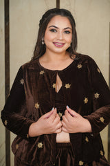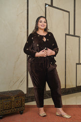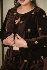 Brown Embroidered Velvet Jacket-Plus Size