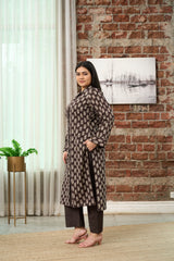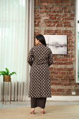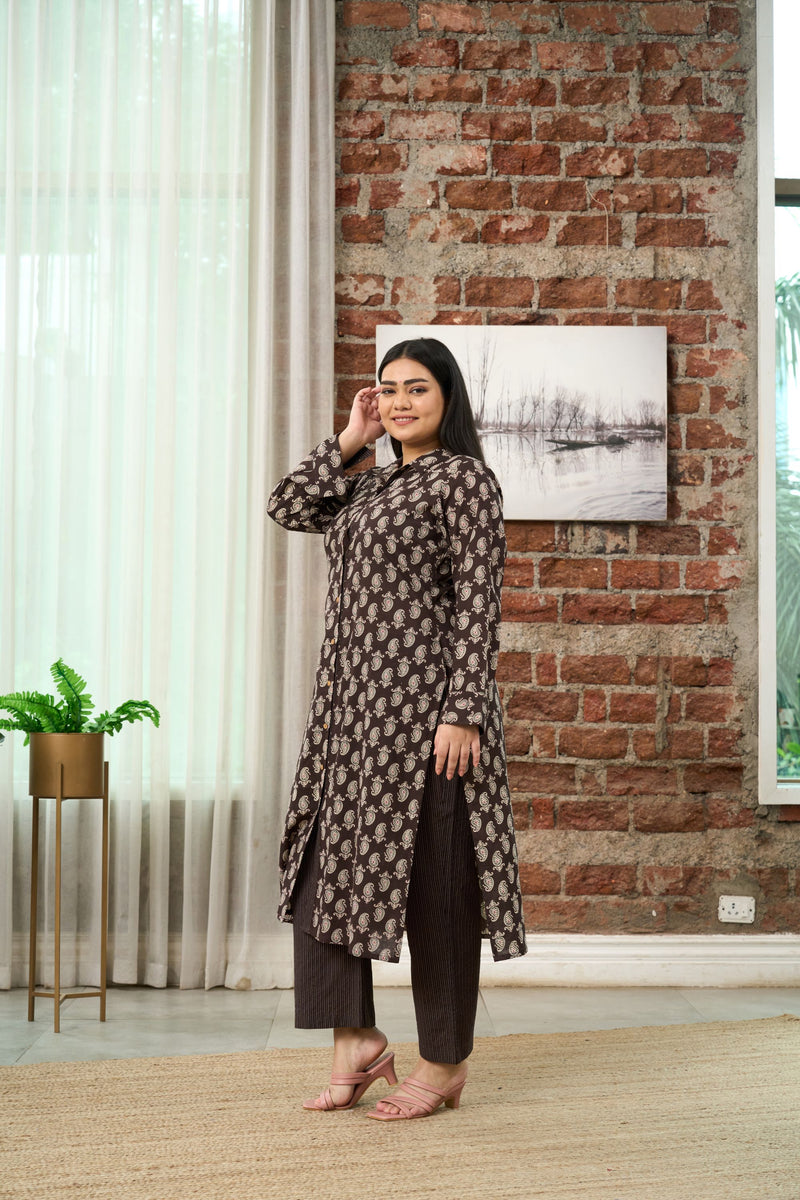 Elevate your style with this Brown Cotton Kurta Set. The kurta features a delicate paisley print and classic elements like a collared neckline and buttoned front, creating a timeless look. Paired with the straight pants, it is a perfect fusion of heritage and modernity.