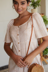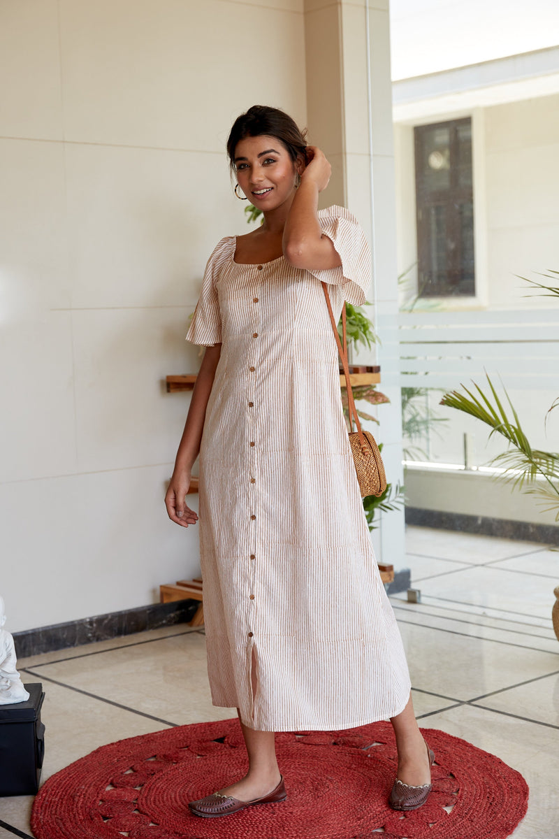 It's a brown striped midi shirt dress with U neck and statement sleeves. It's a hand block printed cotton dress comes no lining inside for assured comfort. Dress-up and get ready for your day party with this funky dress. Crafted in finest fabric which is soft to touch and comfortable enough to wear all day long.