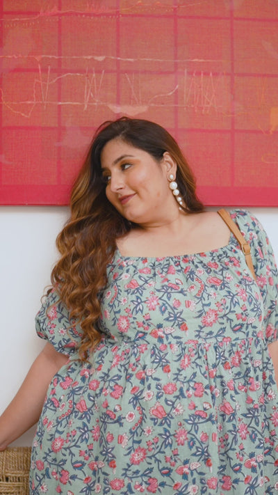 It's a cute Blue Pink Floral Dress with nice sleek tiers. Slay in comfort in this gorgeous cotton dress. Gather all the 90's Victorian vintage feels.