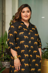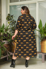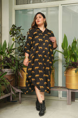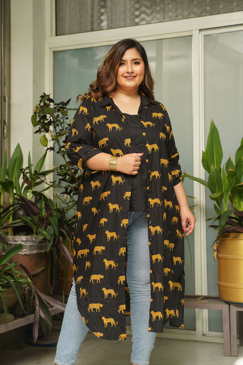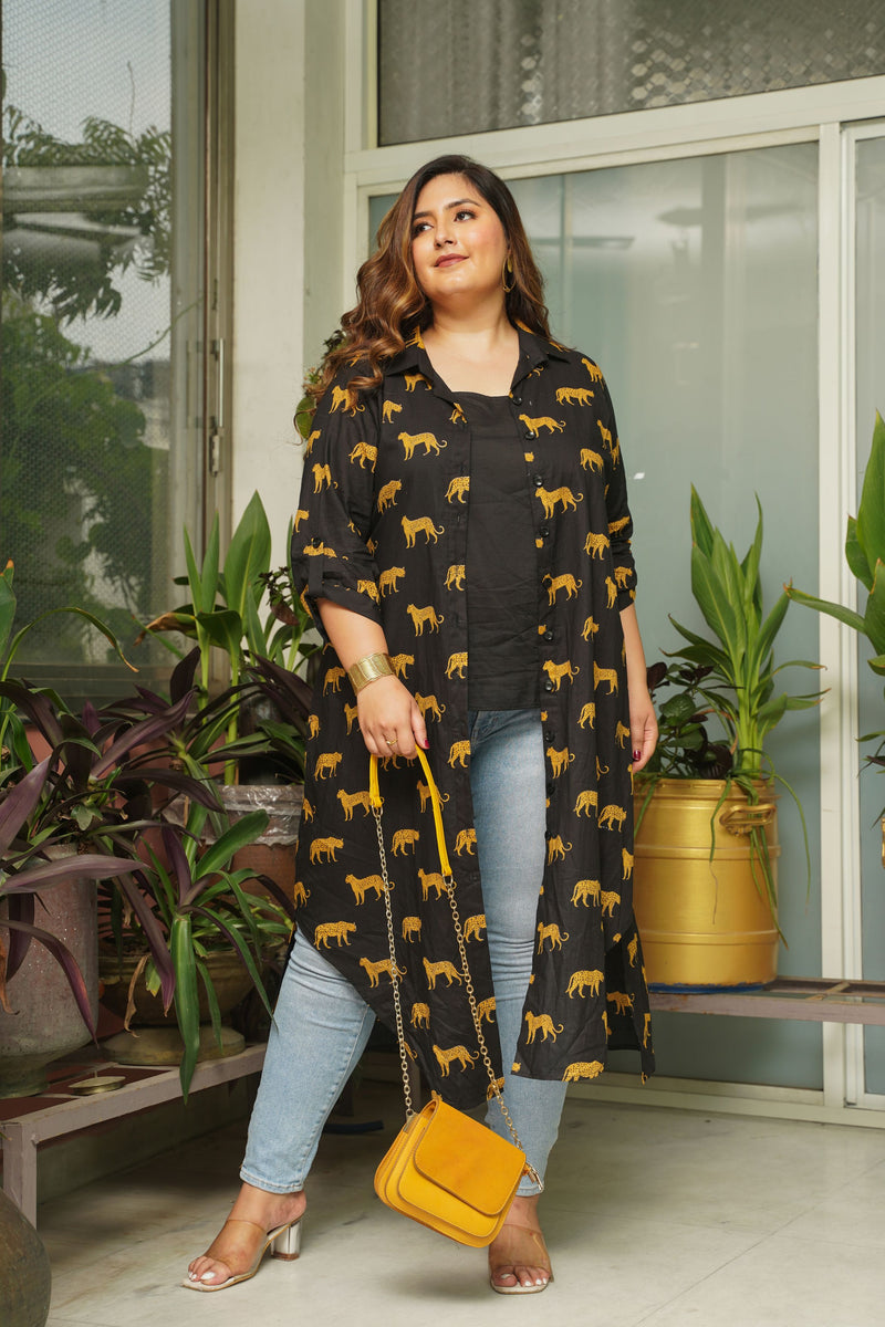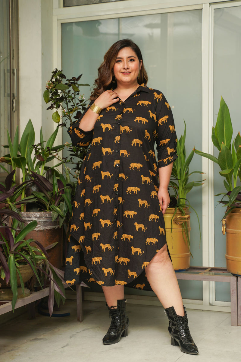 | Dress it up or down!! This cheetah print Shirt dress will surely catch anyone's eyes. The dress has low slits with a smart cut on slit.Functional buttons make the dress more quirky. |