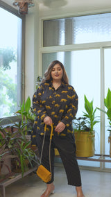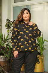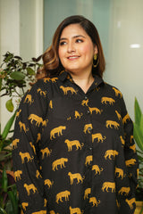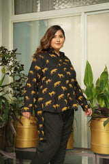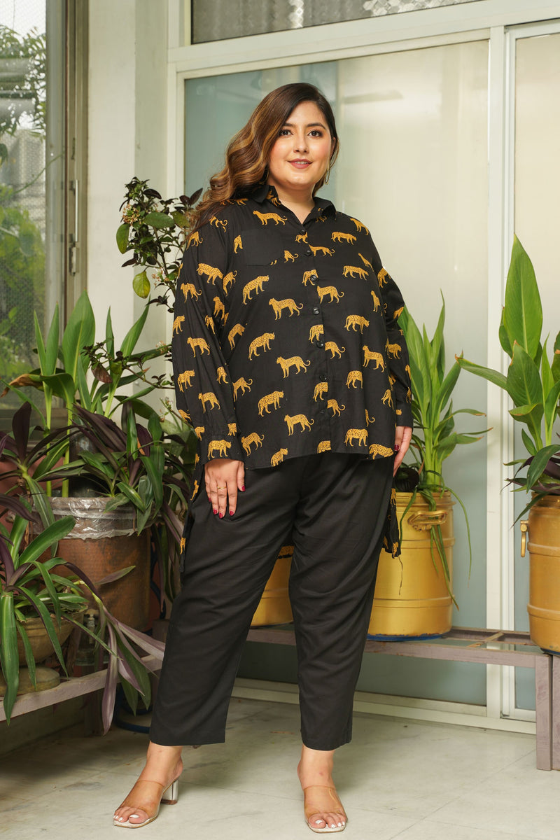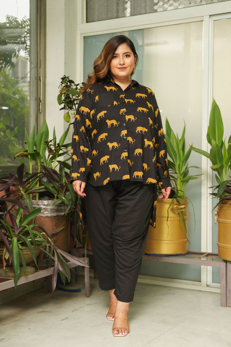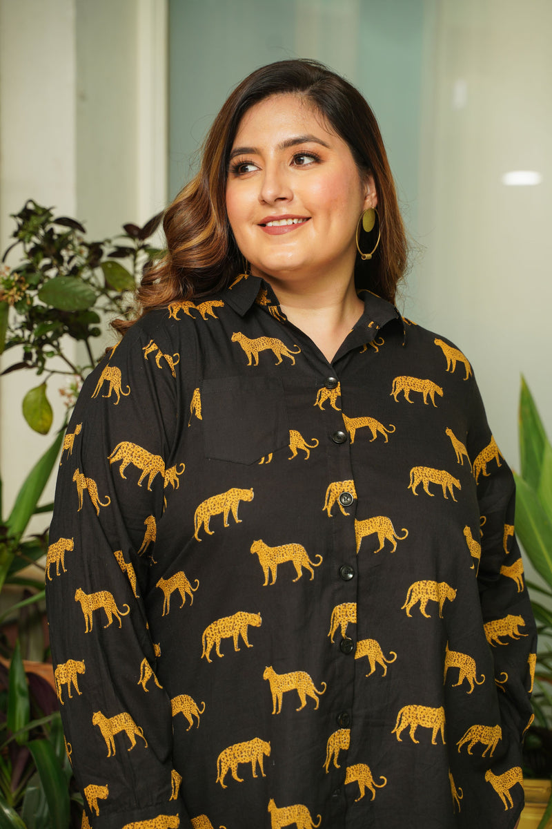 | This black Cheetah shirt is quirky and smart both. Wear it with smart denims or formal trousers or tuck it in, otherwise make it playful with a crop top or inner inside. and functional buttons ( they open ) |