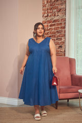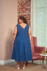 | This dress is made in fine cotton in blue color with silver zari weaving, suitable for both party wear and work wear. This party wear dress is super comfortable with good fitting, making it great work wear as well. The dress has a biased flare for a chic look, perfect for elevating your work wear. Wear it with a cape or jacket to make it dressier for work wear occasions. |
