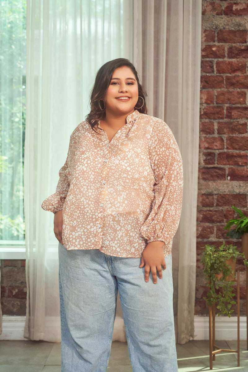 | Our Georgette shirt is a perfect summer staple for your work wear wardrobe. Tailored with sartorial perfection, this shirt comes in georgette fabric. It’s a lightweight button-down shirt with three-quarter balloon sleeves, a mandarin collar, and features a dotted print all over. |