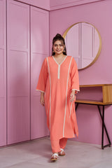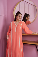 Our Coral Peach Modal Kurta Set is crafted from breezy modal fabric for ultimate comfort. This elegant set features a stylish full-sleeve kurta paired with matching solid pants in a beautiful coral peach color. Designed with pockets for storage purposes and the white crochet lace adds contemporary twist to this Indo-western outfit. Ideal for small puja gatherings or temple visits.