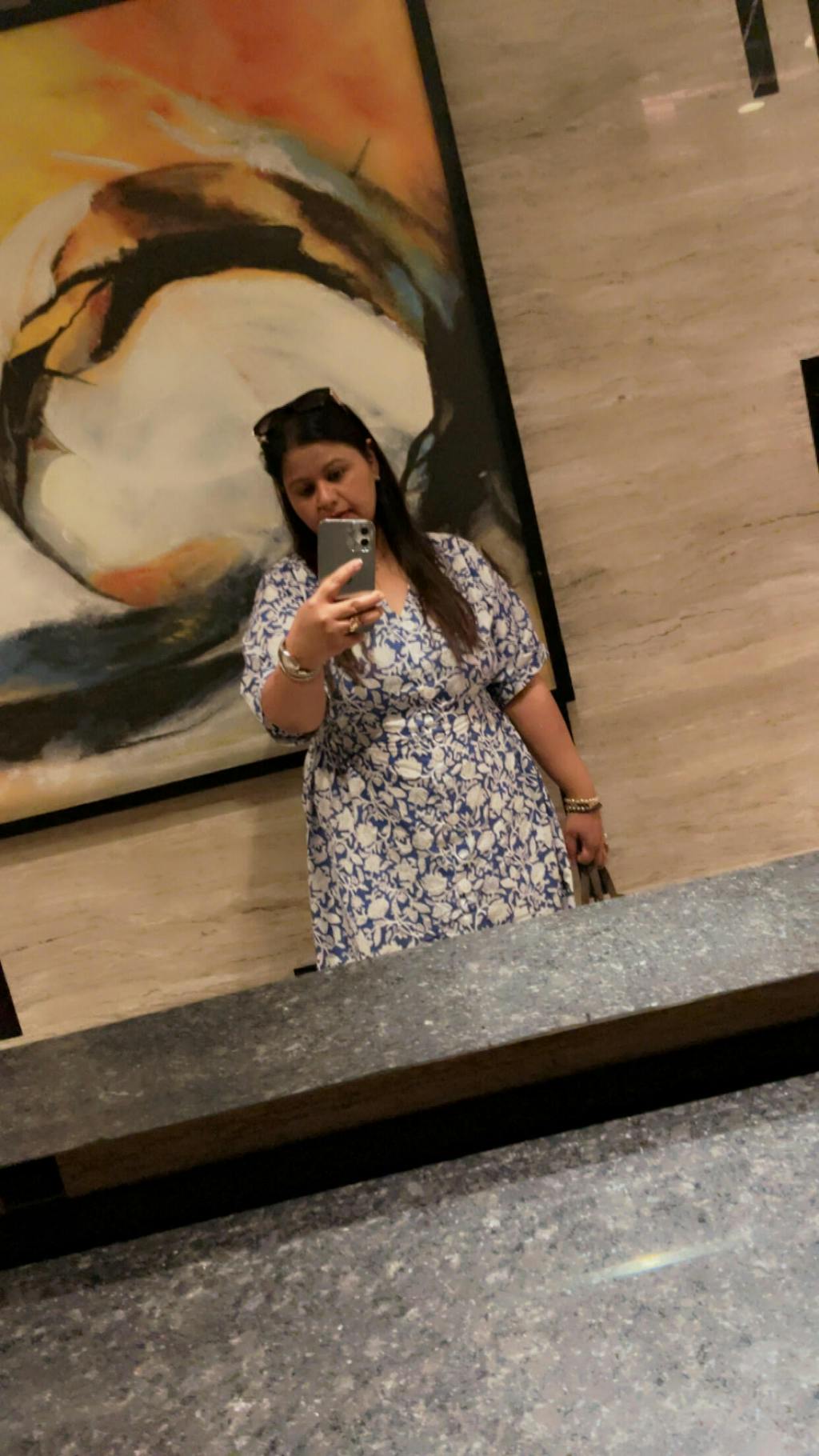 This is a floral hand block print 100% cotton blue dress with button detailing in front and a low slit in center. It is mid calf length.