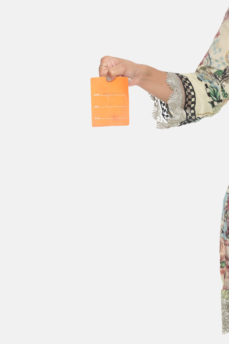 It's a split neckline straight side slit kurta with lace details on the front bodice & sleeves of the kurta. Perfect for summer outing.