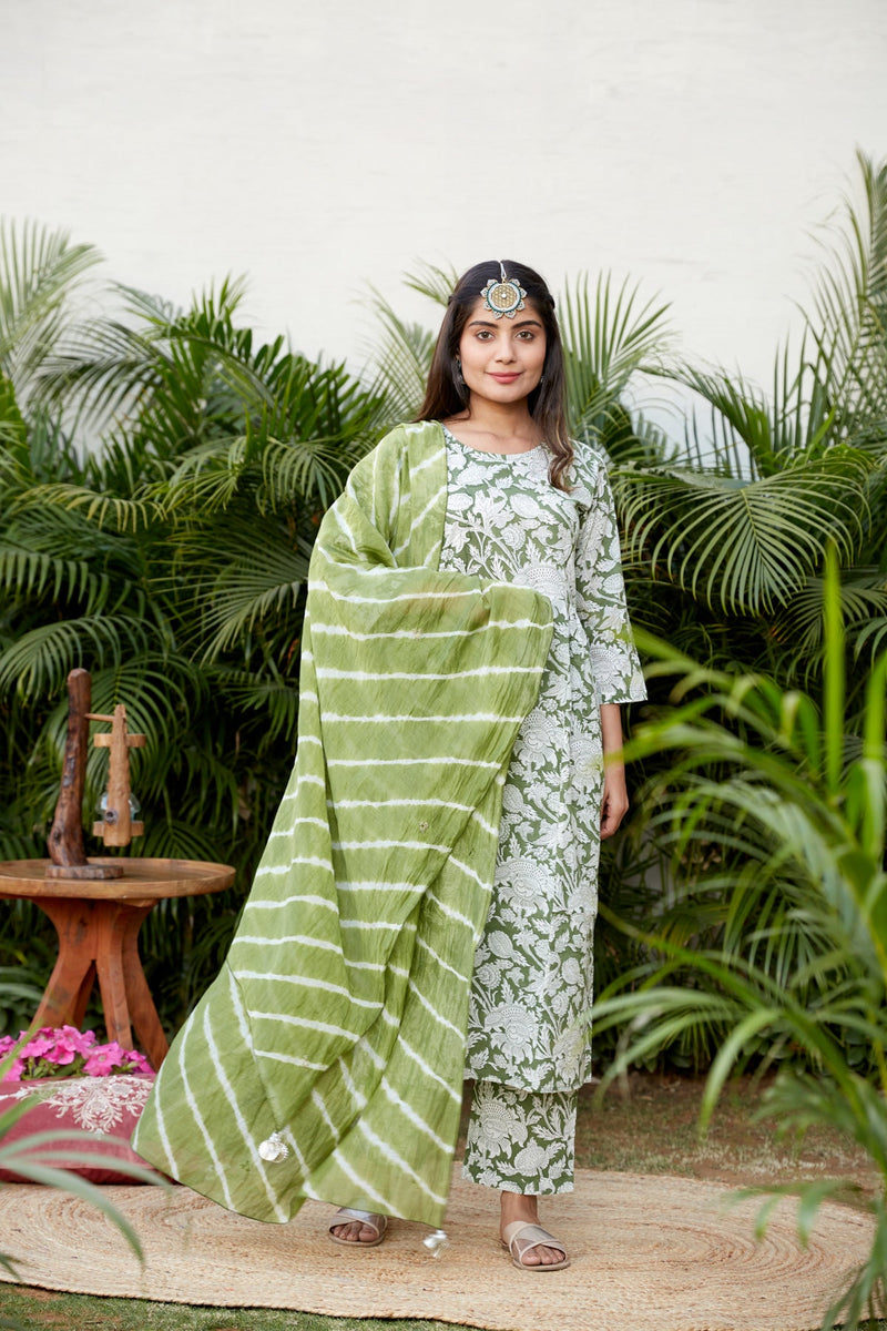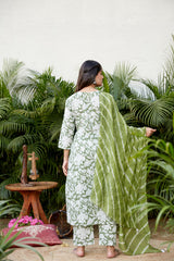 Cotton Green Floral Printed Kurta Set - (Set of 3)