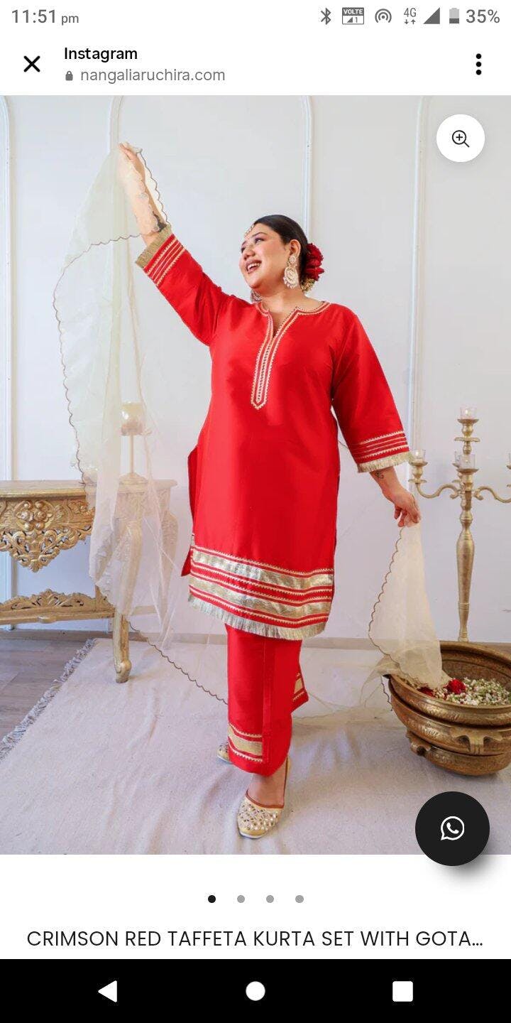 A classic festive taffeta kurta set that radiates bold elegance. This A-line kurta features a round neckline with a slit, highlighted with gota lace and golden trims on the neckline, sleeves, and hem. The set includes straight pants with coordinated detailing and an organza dupatta with scalloped edges. The lustrous taffeta fabric gives a structured yet graceful appeal, perfect for Karwa Chauth, Diwali gatherings, or pre-wedding events.